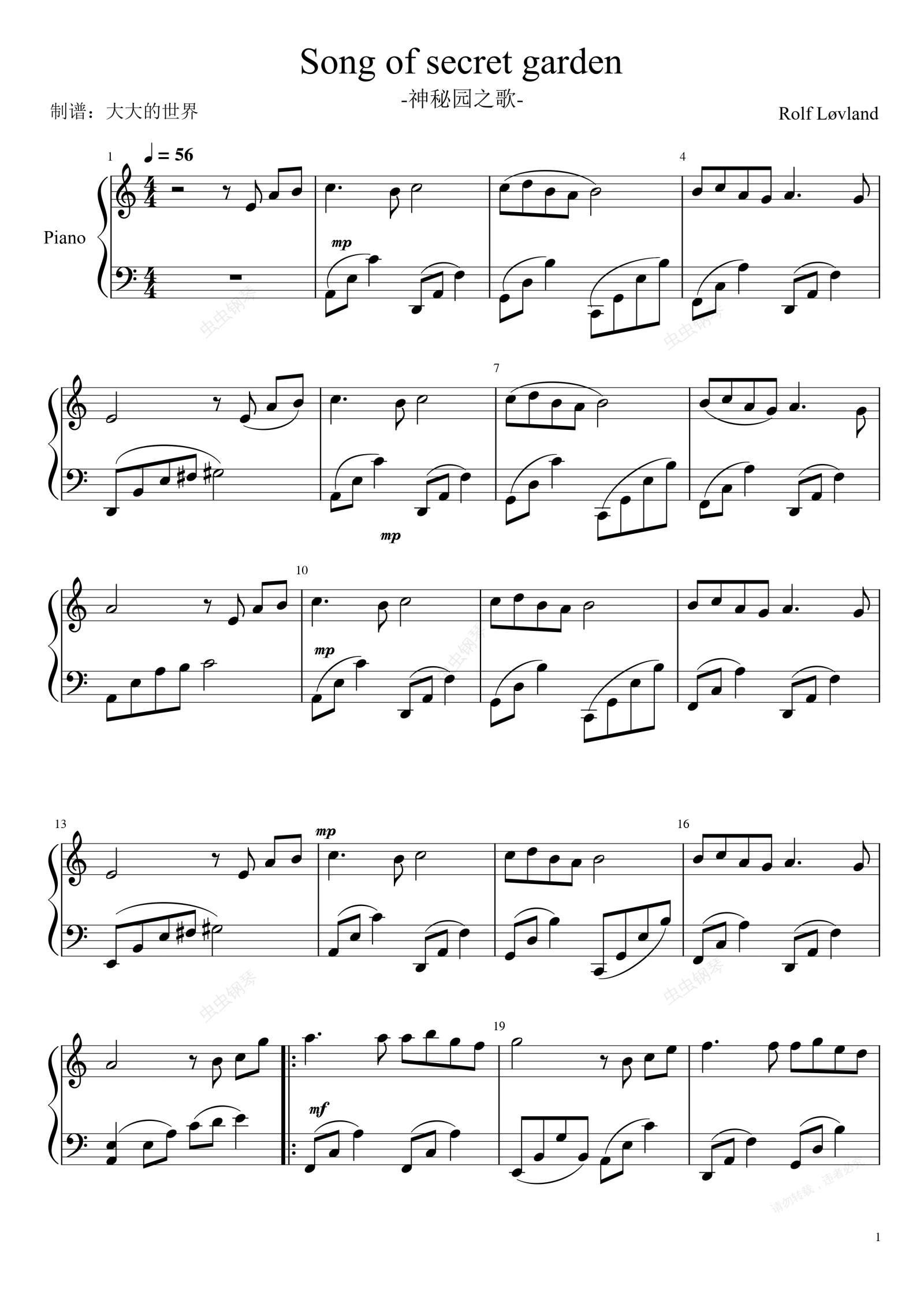 钢琴谱:神秘园之歌(钢琴谱)-Song of secret garden(C调简单独奏版)