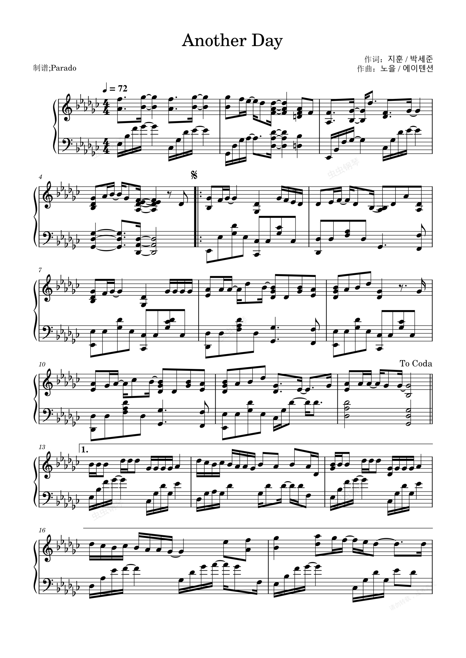 钢琴谱:Another Day - Monday Kiz -《德鲁纳酒店》插曲