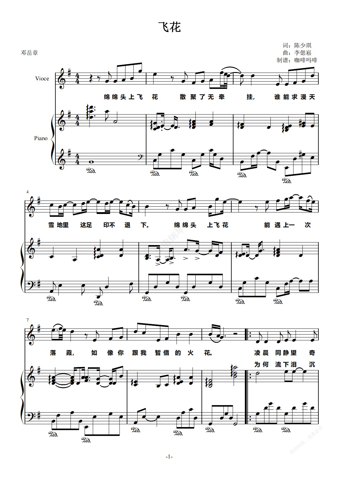 钢琴谱:飞花-邓岳章 原版钢琴伴奏谱