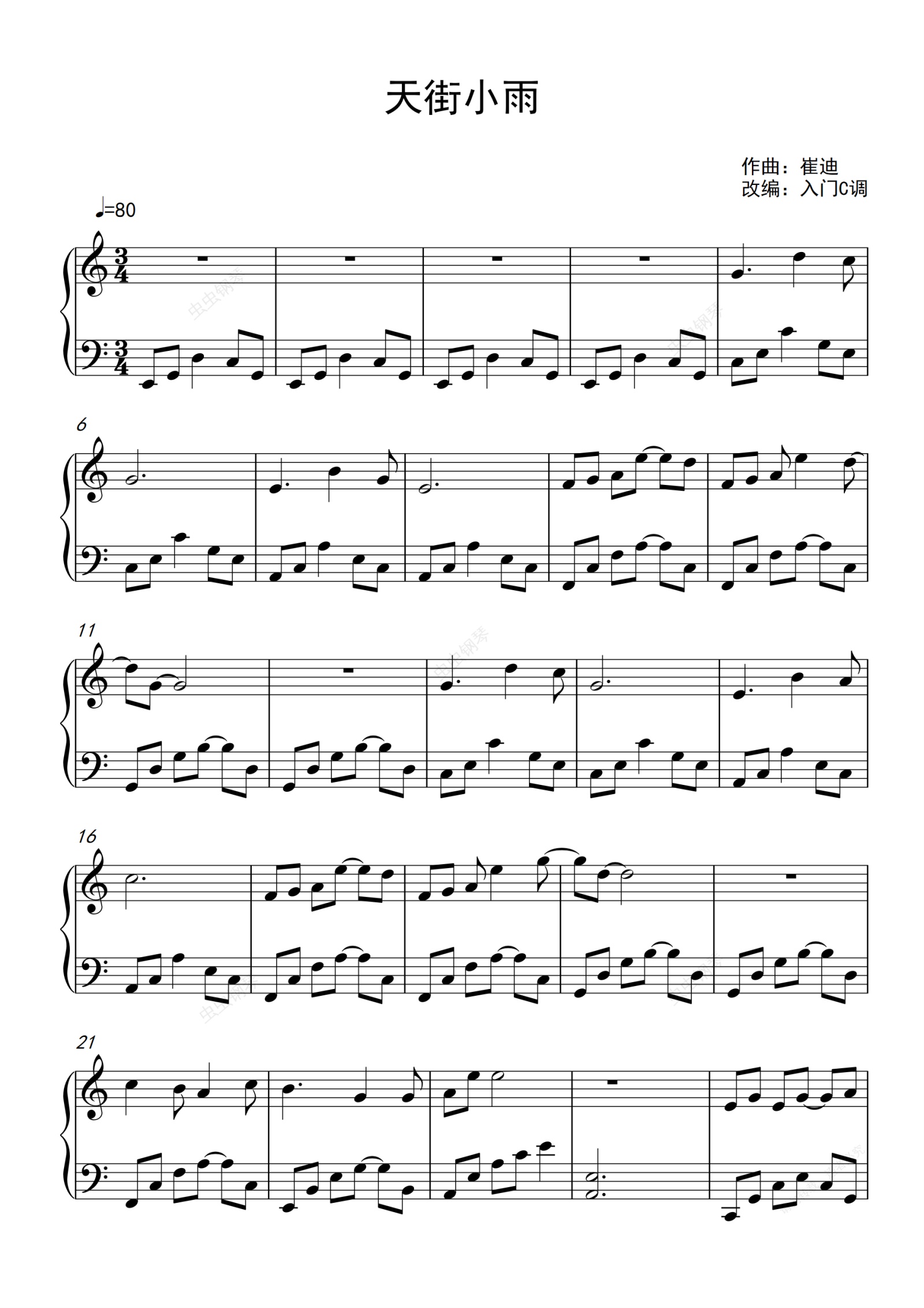 钢琴谱:张含韵《天街小雨》经典永流传入门C调简单版