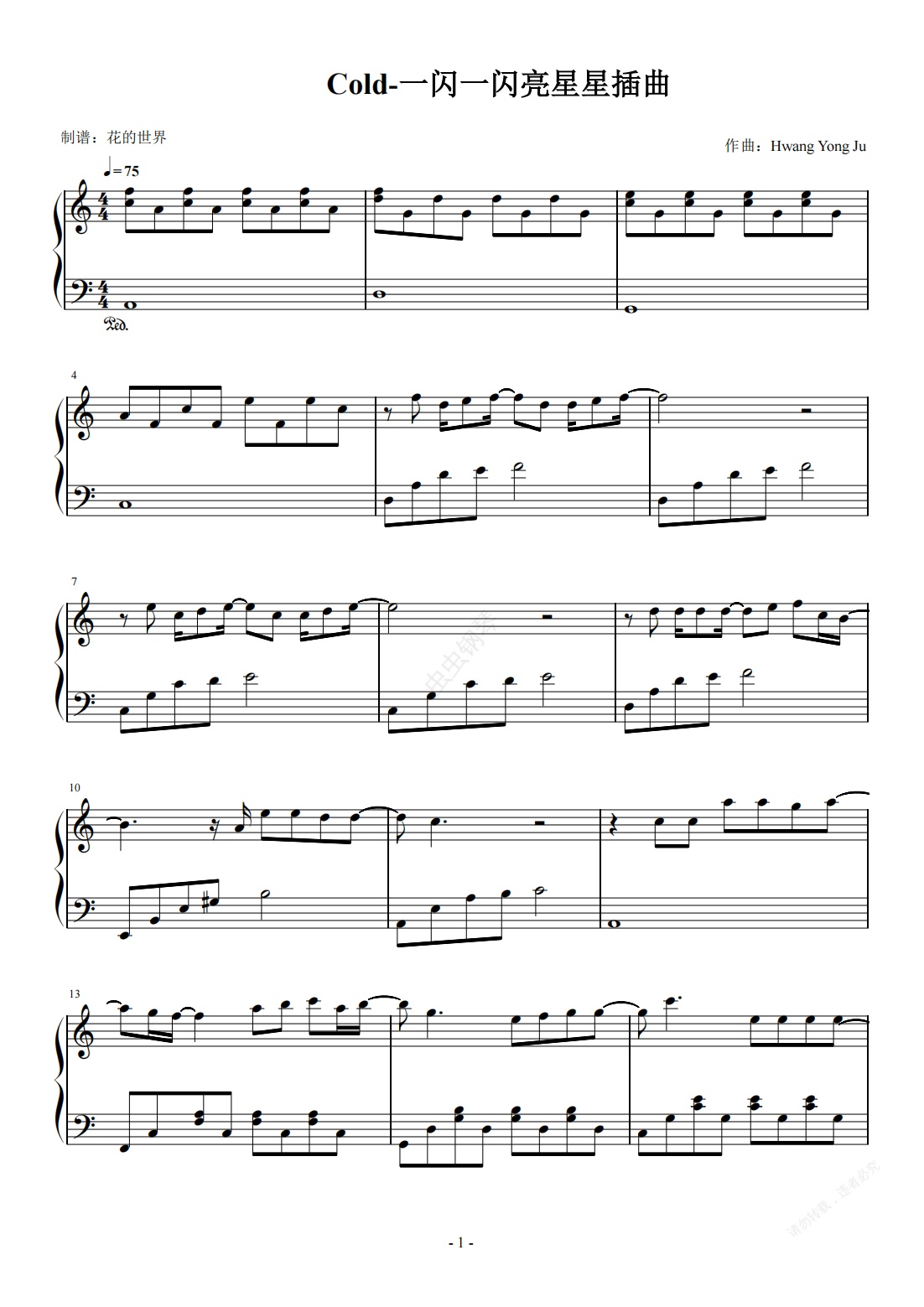 钢琴谱:Cold 萨吉 C调简易版《一闪一闪亮晶晶》