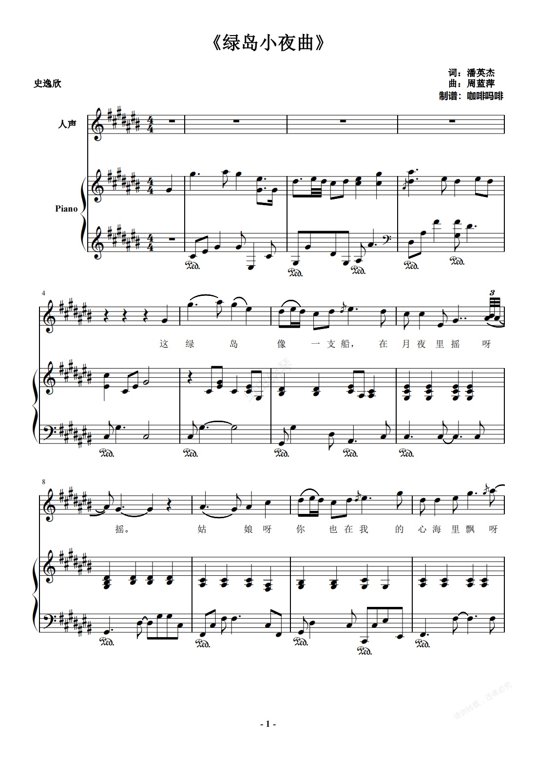 钢琴谱:绿岛小夜曲-史逸欣 精制钢琴伴奏谱
