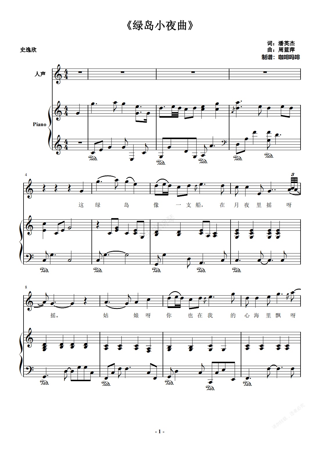 钢琴谱:绿岛小夜曲-史逸欣 C调精制伴奏谱