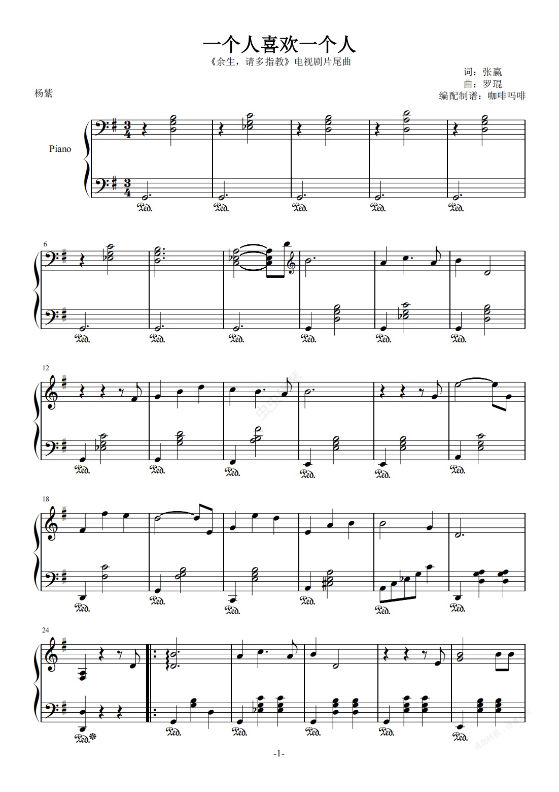 钢琴谱:一个人喜欢一个人-《余生,请多指教》片尾曲 钢琴独奏谱