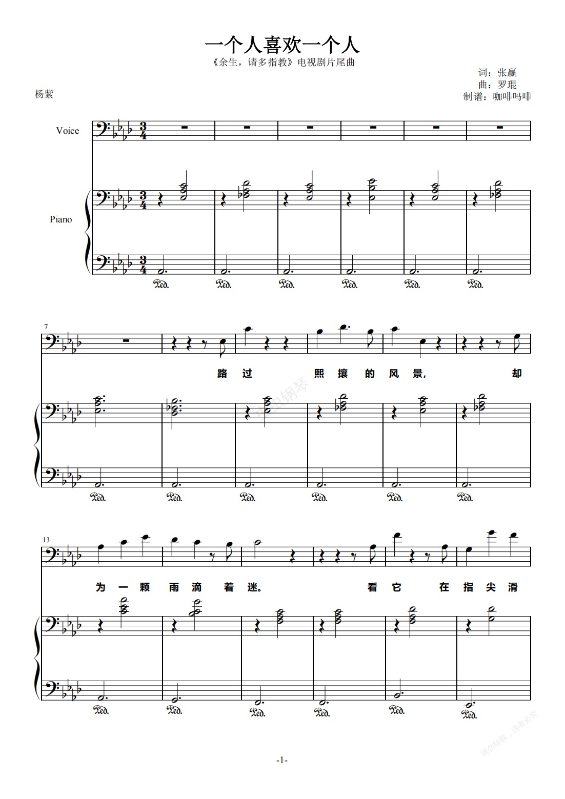 钢琴谱:一个人喜欢一个人-杨紫 钢琴伴奏谱