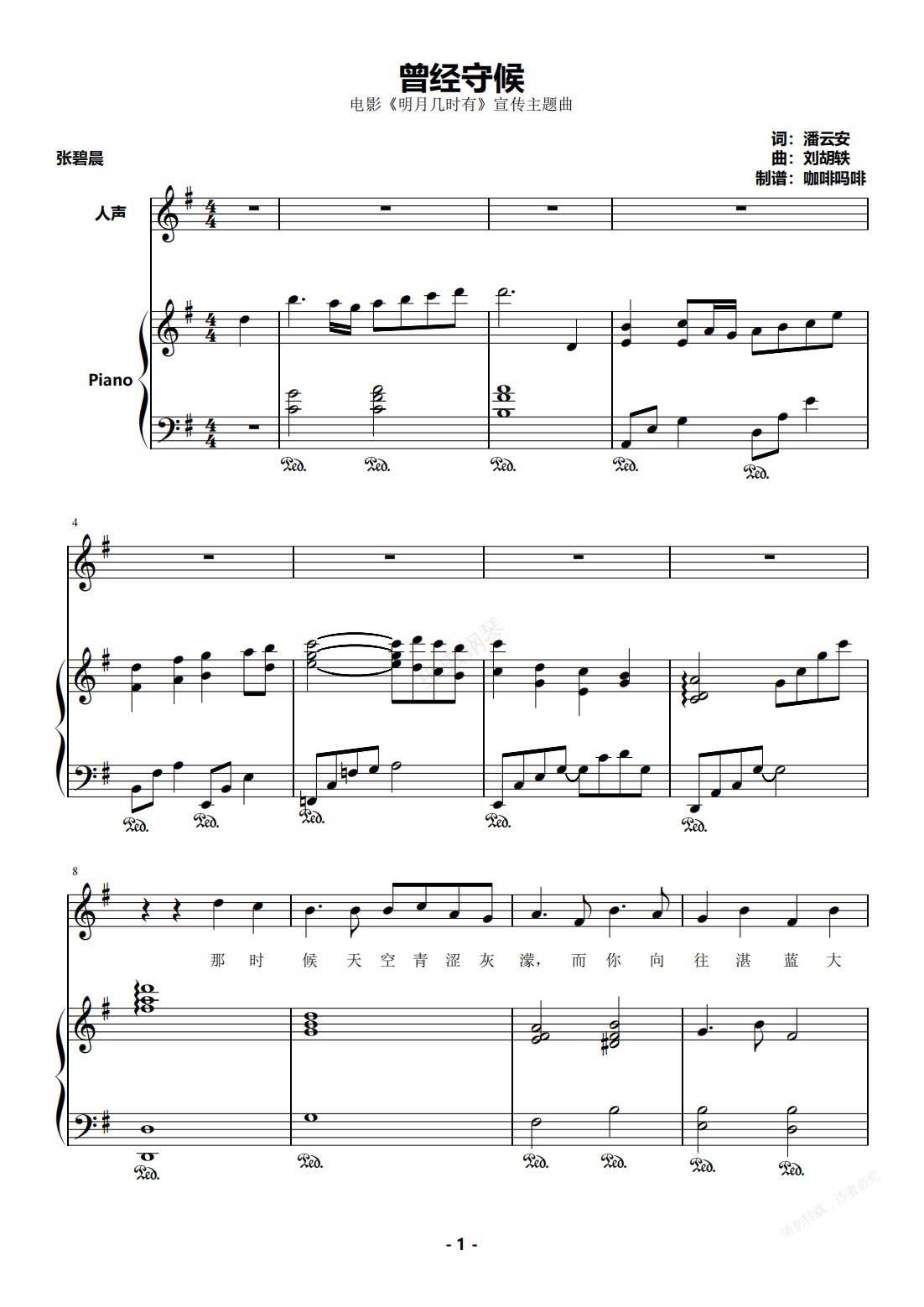 钢琴谱:曾经守候-张碧晨 钢琴伴奏谱