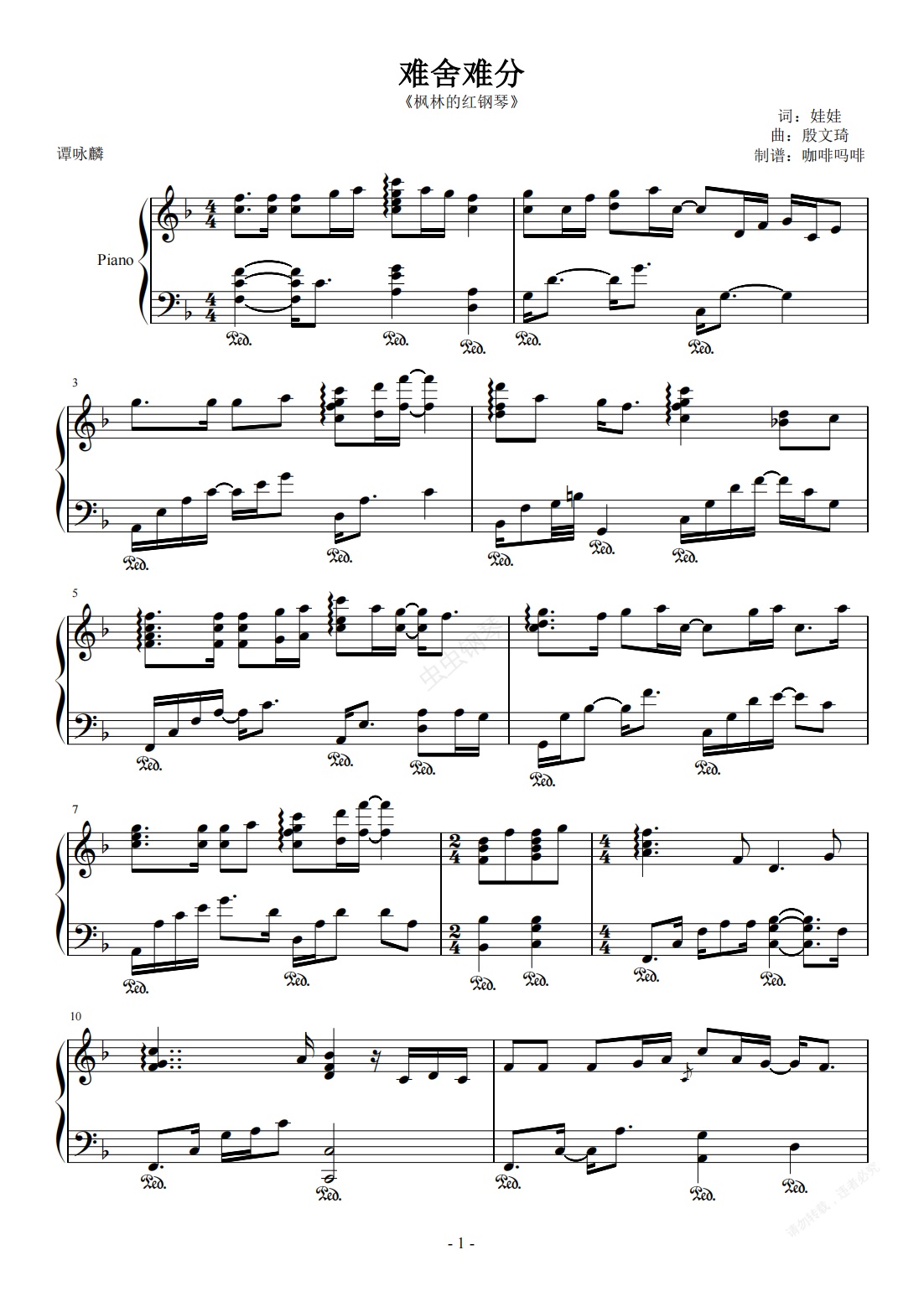 钢琴谱:难舍难分-谭咏麟 钢琴独奏版