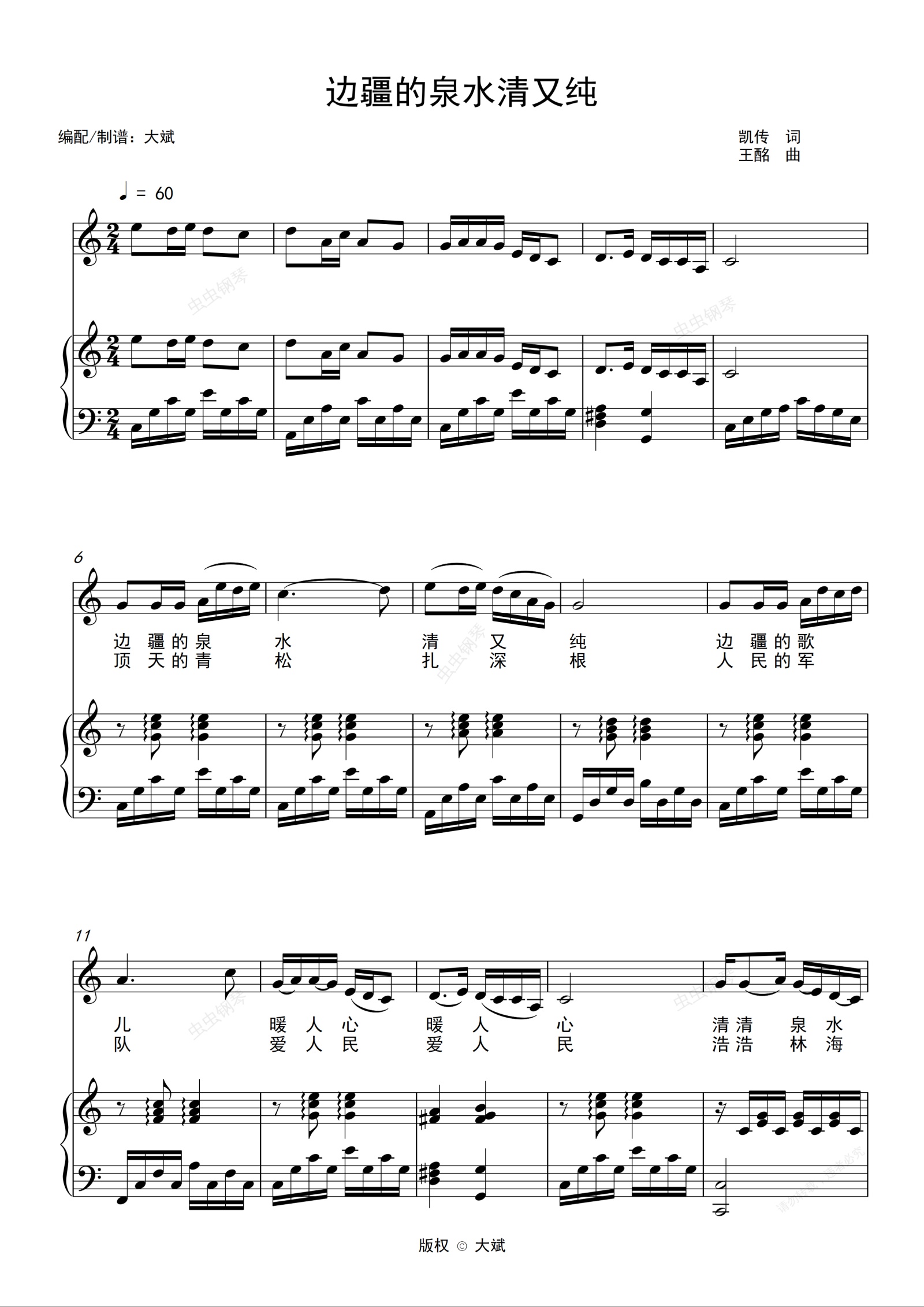 钢琴谱:边疆的泉水清又纯-C调弹唱