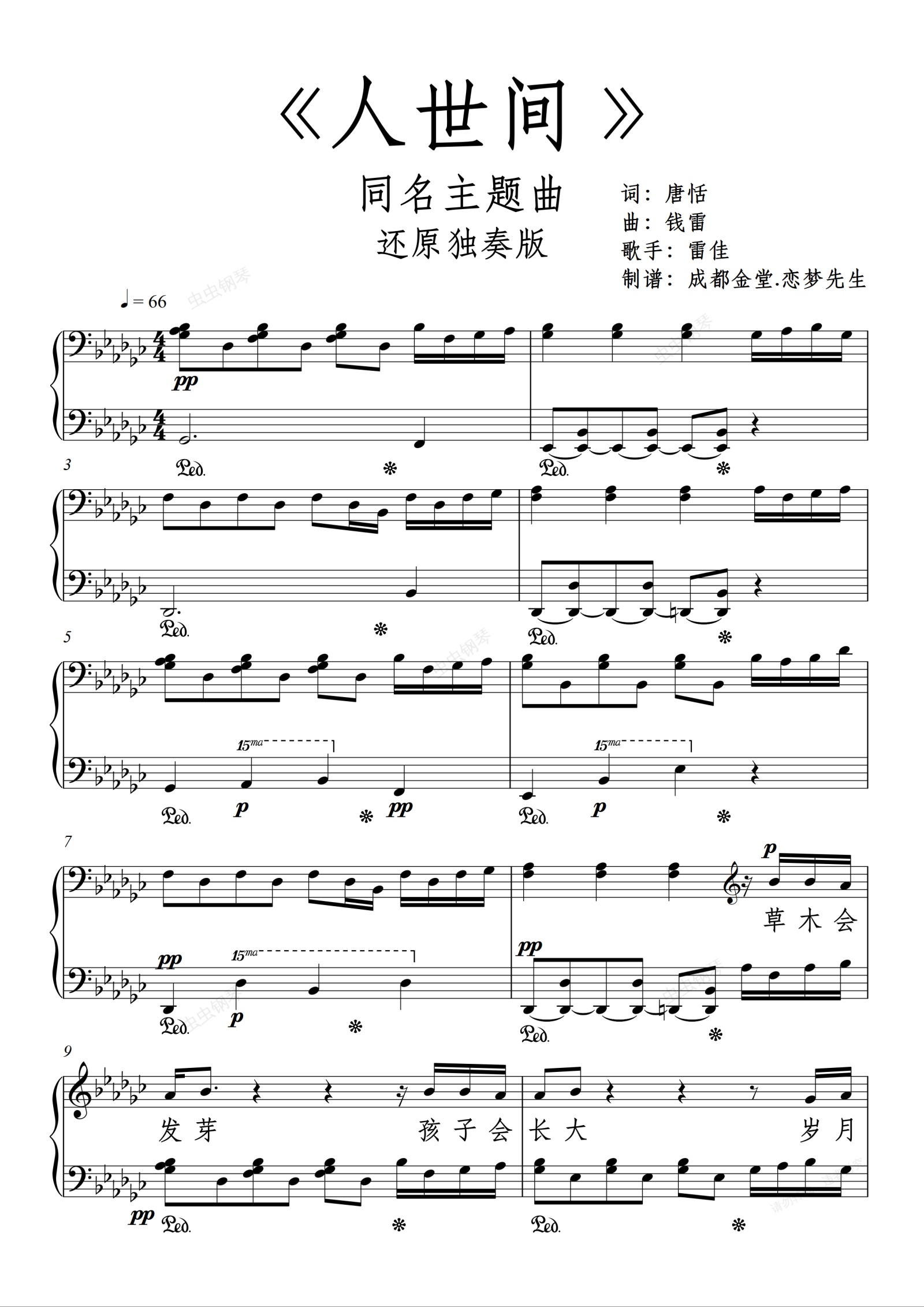 钢琴谱:《人世间》电视剧同名主题曲-还原独奏版