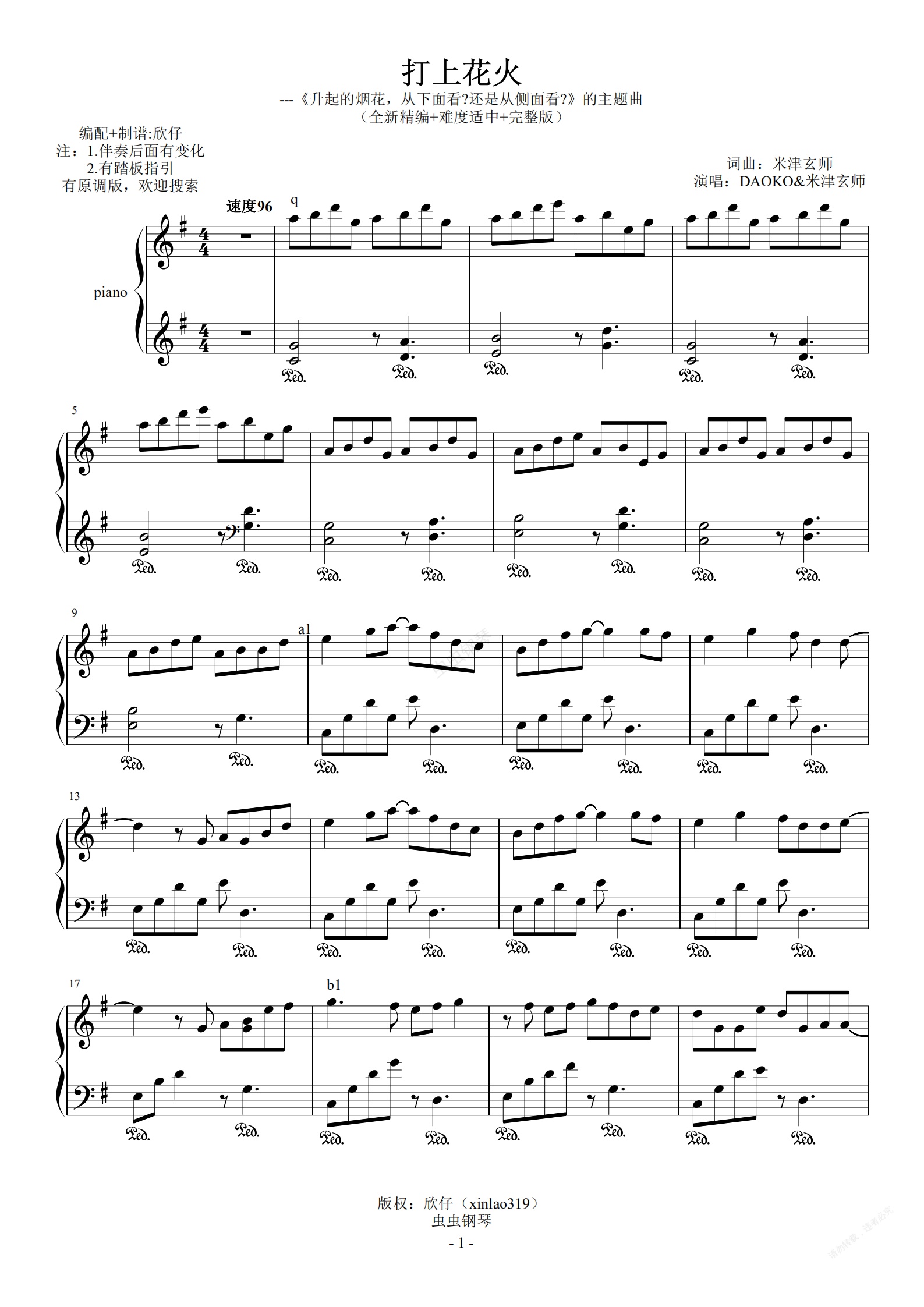 钢琴谱:DAOKO&米津玄师-G-《打上花火》(难度适中+完整版)
