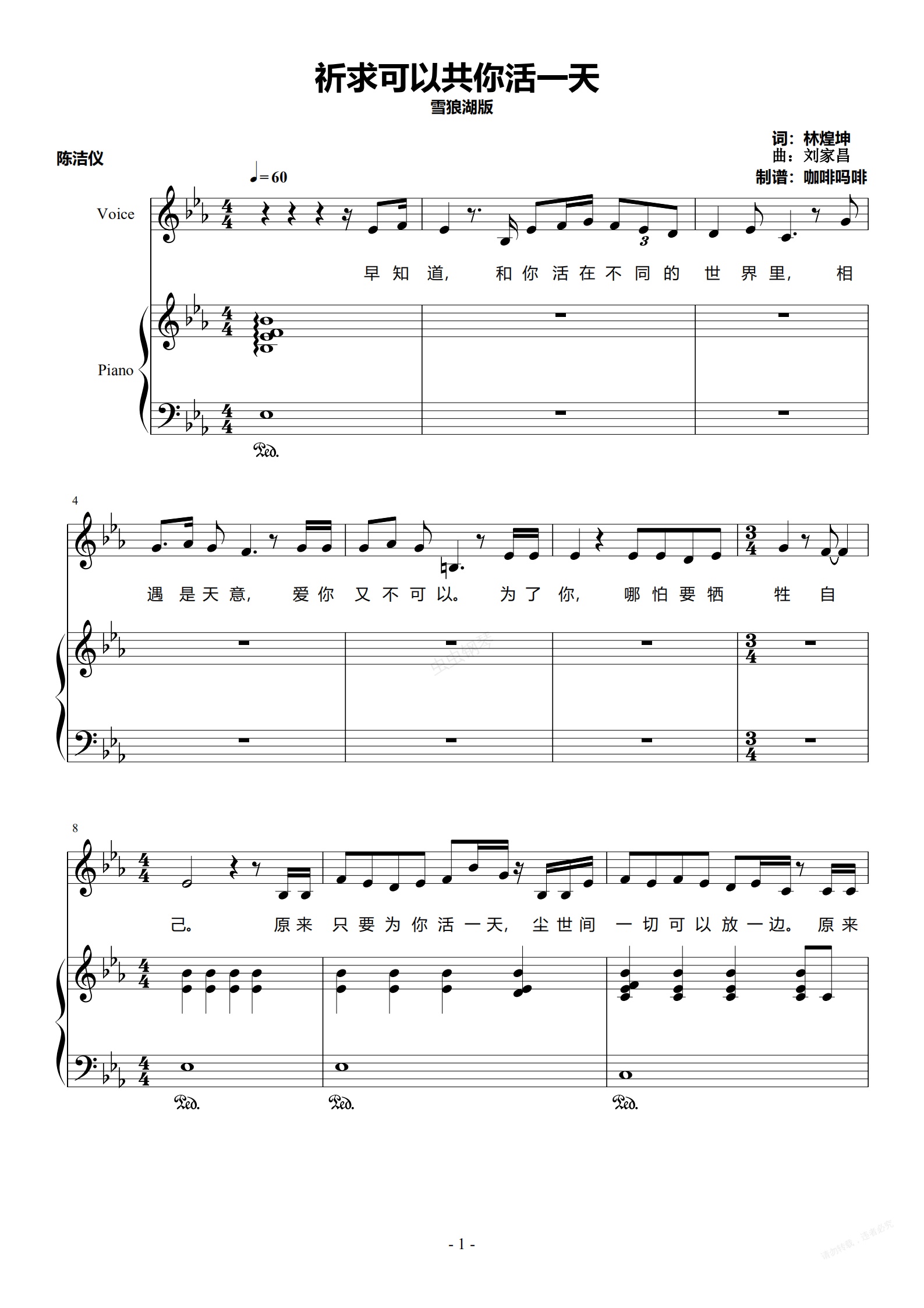钢琴谱:祈求可以共你活一天-陈洁仪 钢琴伴奏谱
