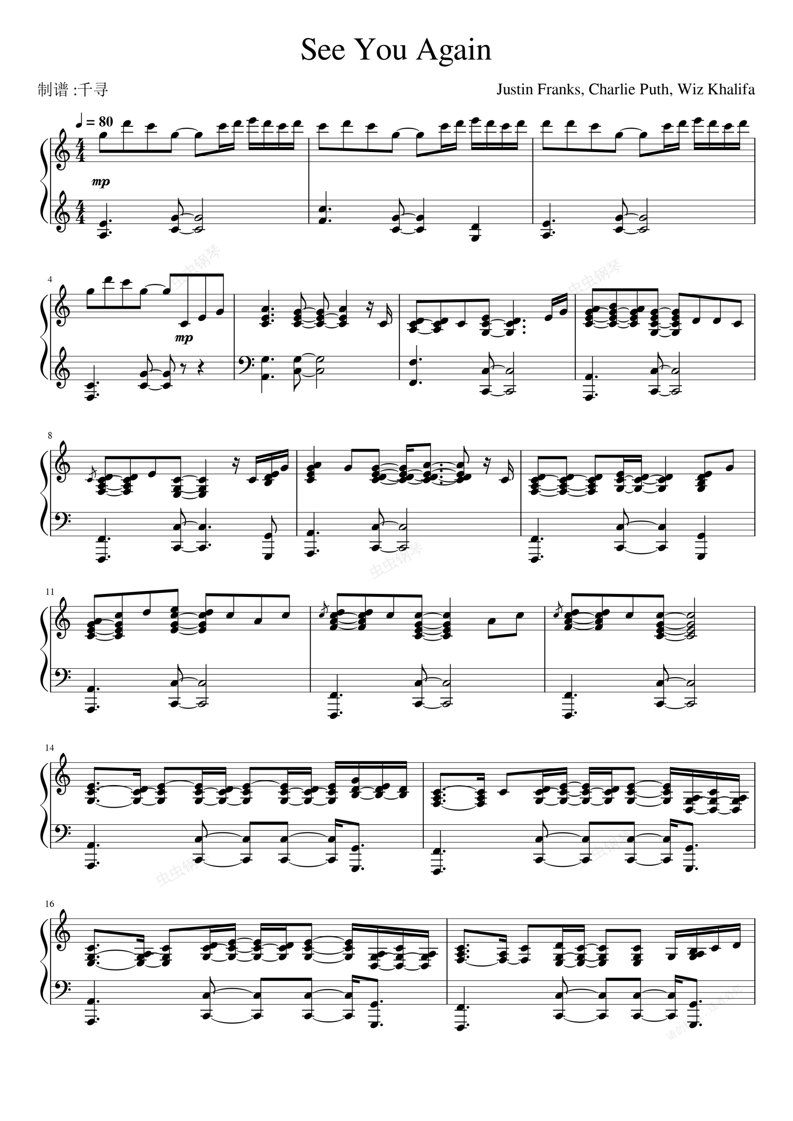 钢琴谱:See You Again 华丽独奏版-速度与激情7主题曲