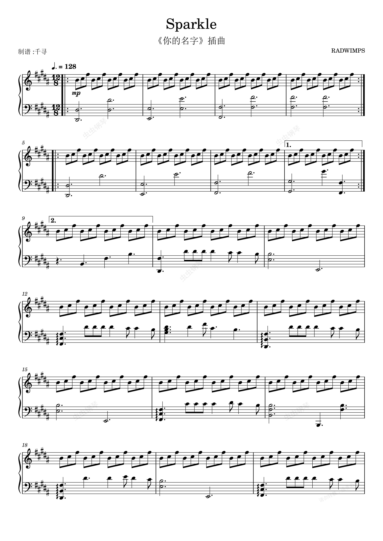 钢琴谱:你的名字-火花 Sparkle/スパークル-钢琴独奏版