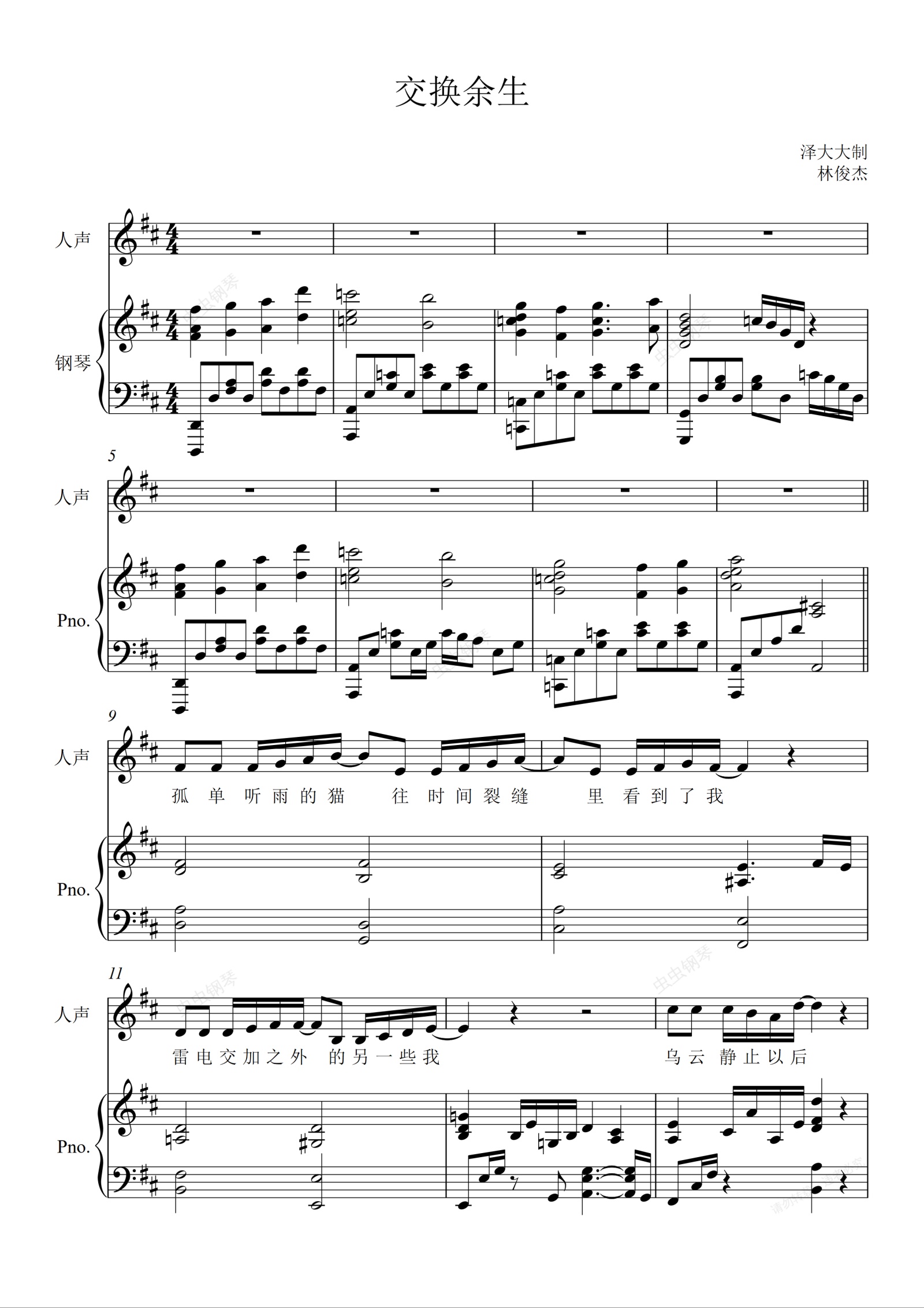 钢琴谱:交换余生【完美弹唱附词】泽大大 林俊杰