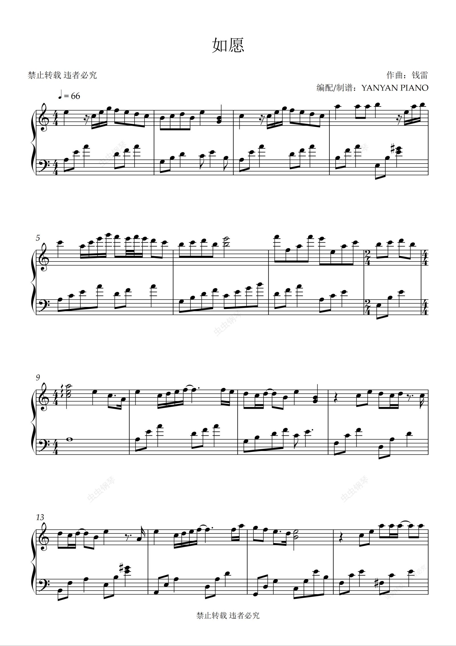 钢琴谱:好听易弹【如愿】王菲