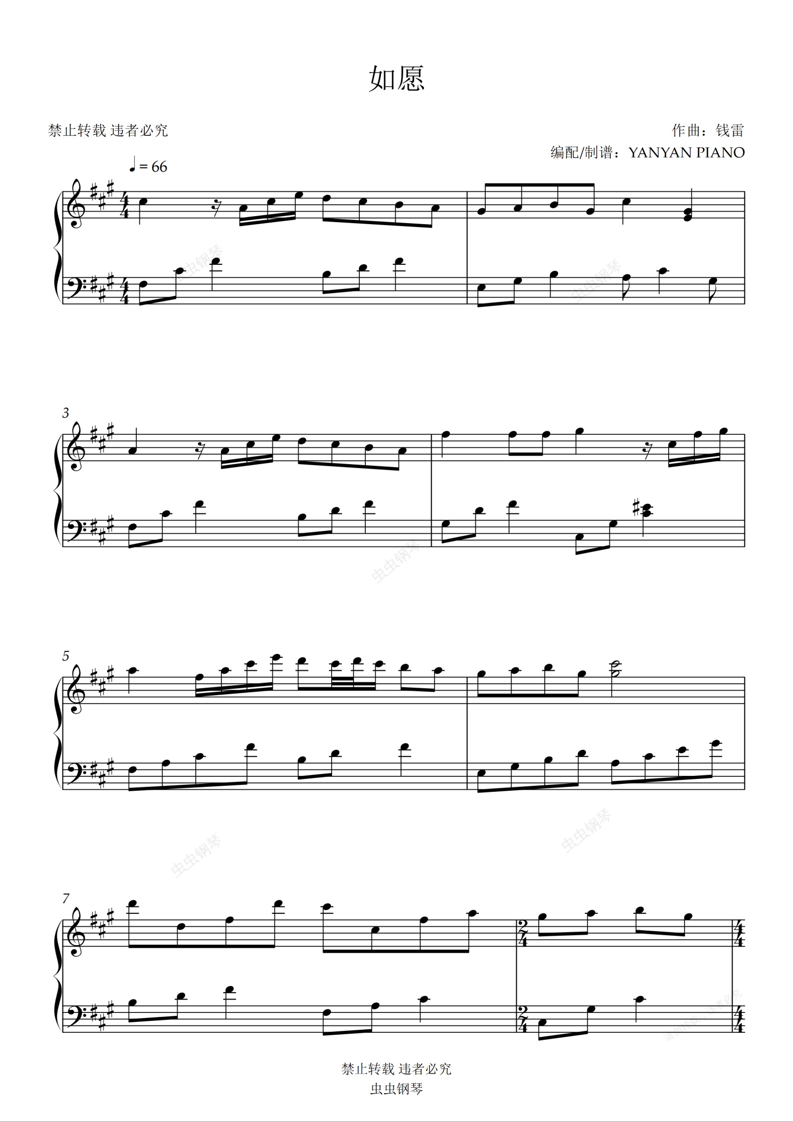 钢琴谱:好听易弹【如愿】王菲