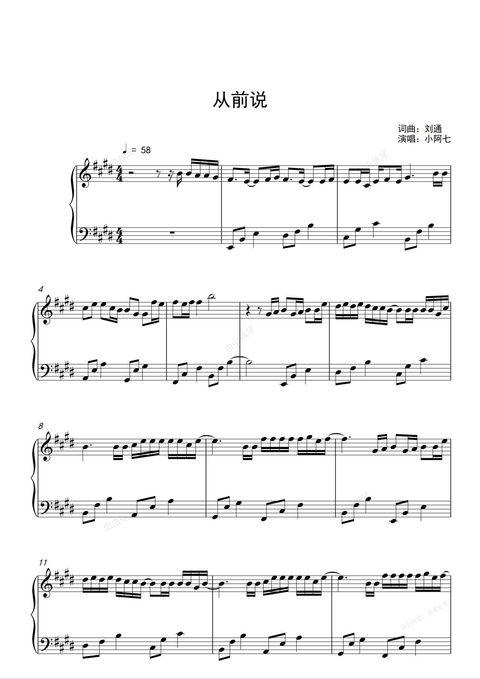 钢琴谱:从前说-小阿七 E调独奏