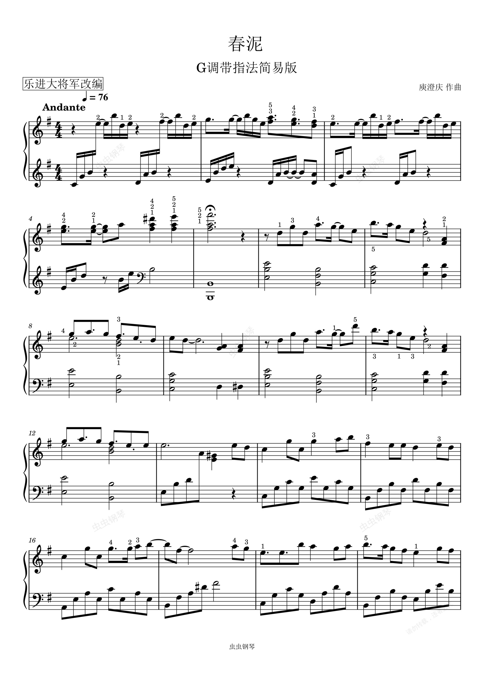 钢琴谱:《春泥》G调精简版 带指法
