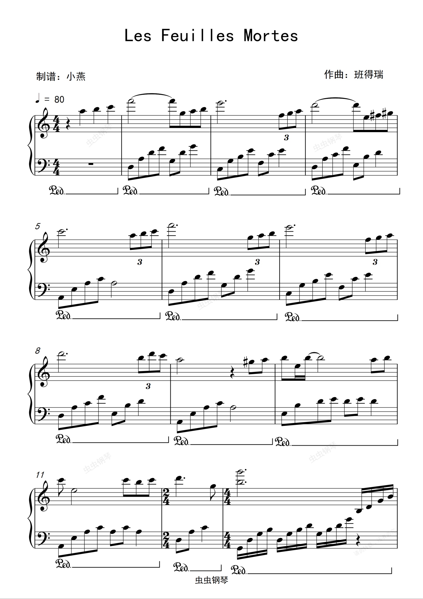 钢琴谱:落叶 (班得瑞) Les Feuilles Mortes