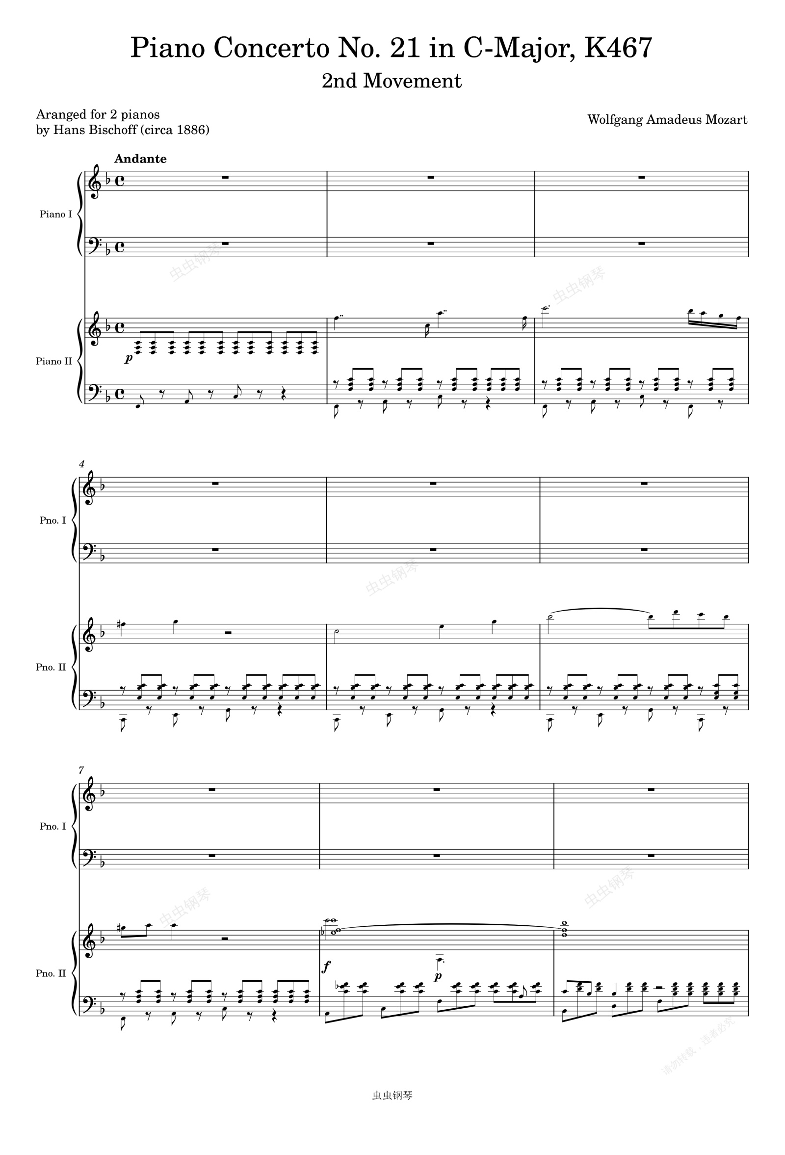 钢琴谱:Mozart Piano Concerto No. 21, K467, 2nd Mvmt (Arr. for 2 pianos)