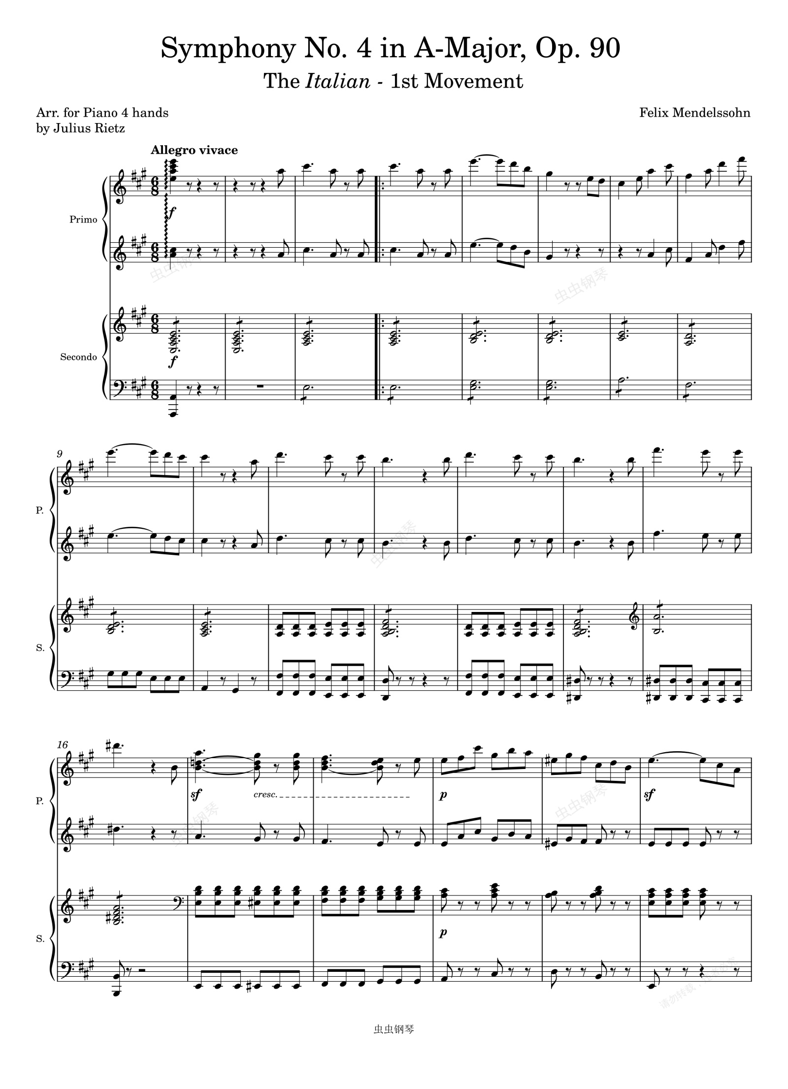 钢琴谱:Mendelssohn Symphony No. 4, Italian, 1st Mvmt, Arr. for Piano 4 hands