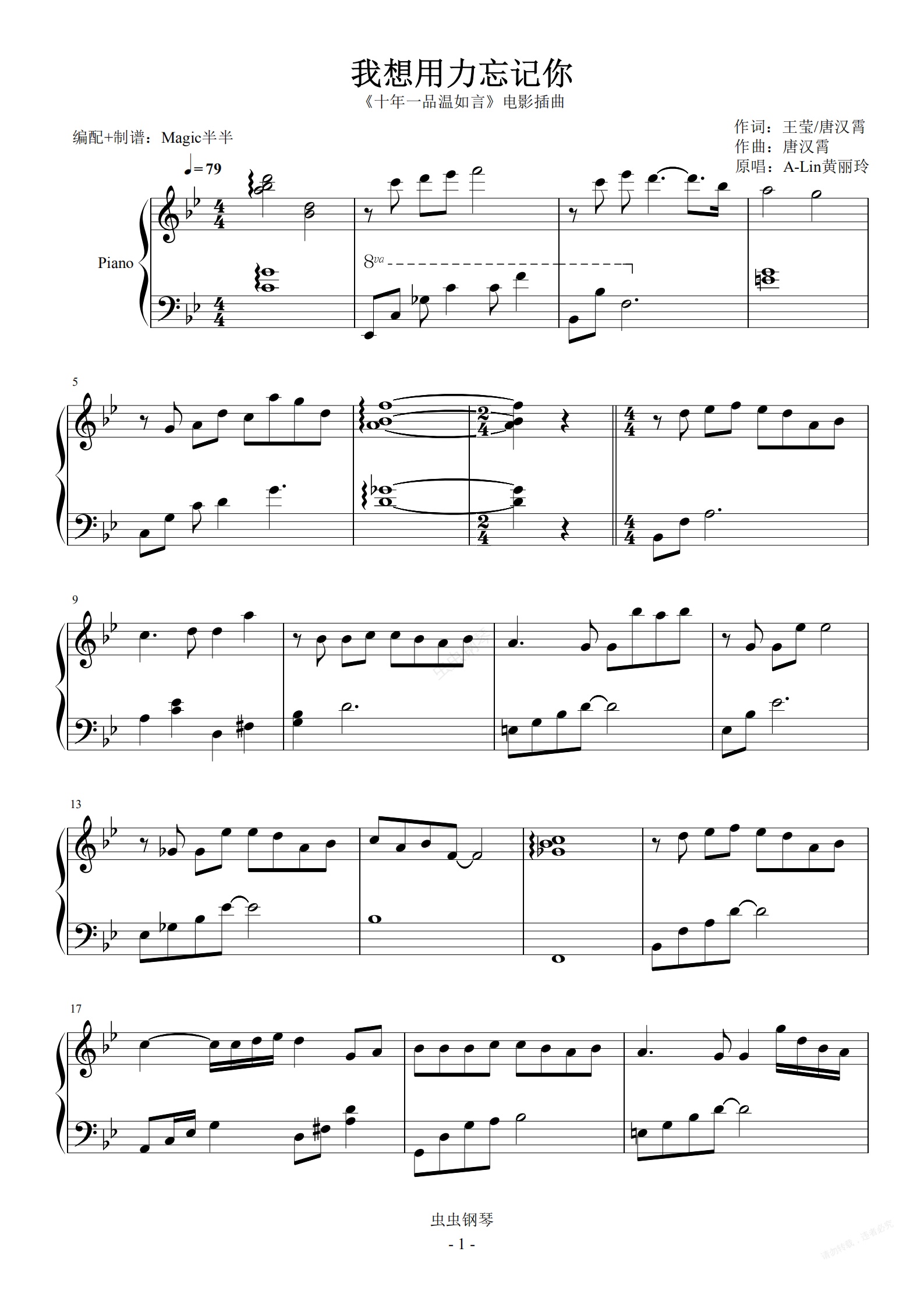 钢琴谱:我想用力忘记你 A-Lin黄丽玲