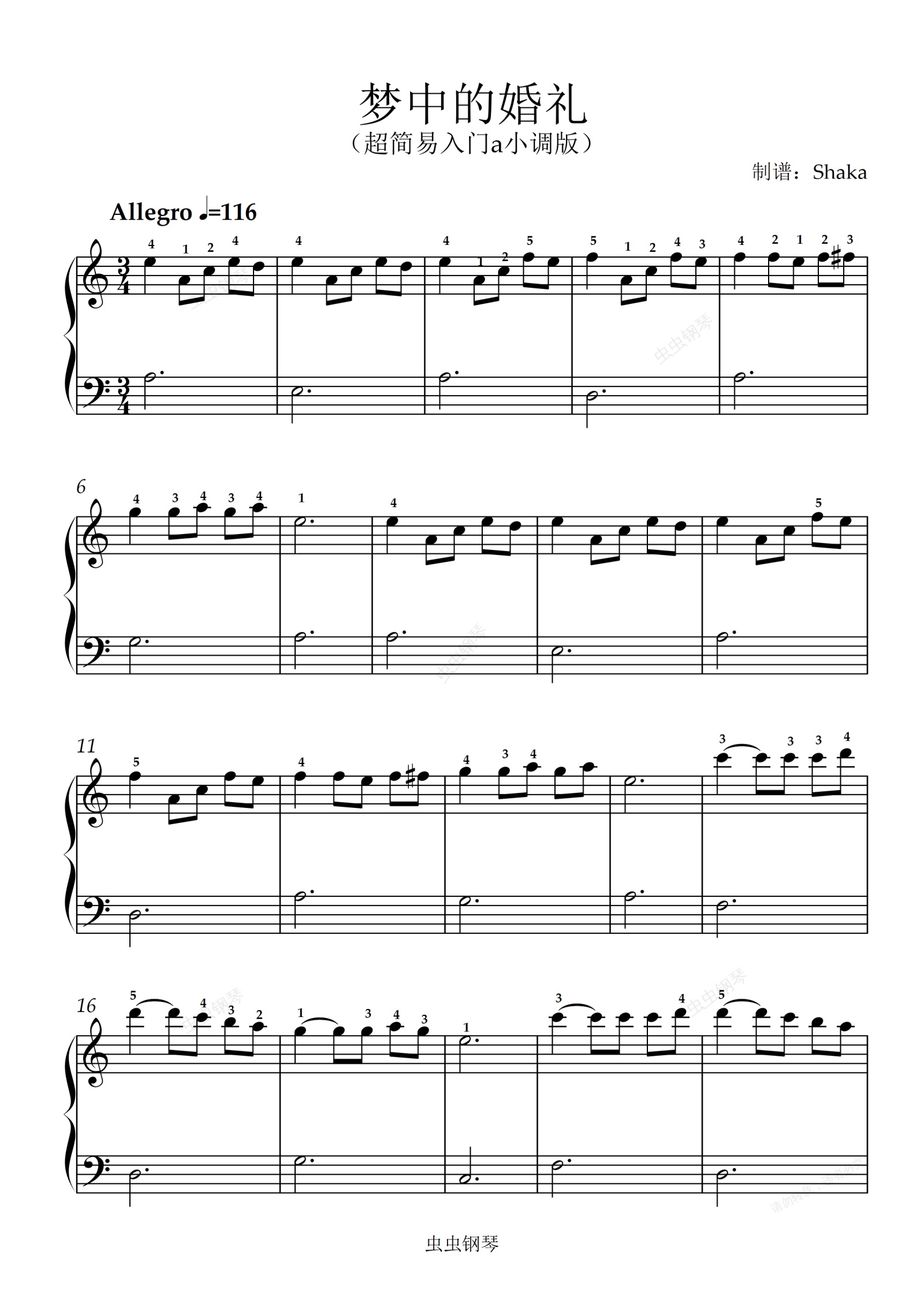 钢琴谱:梦中的婚礼 超简易入门版(a小调无升降号 带指法)