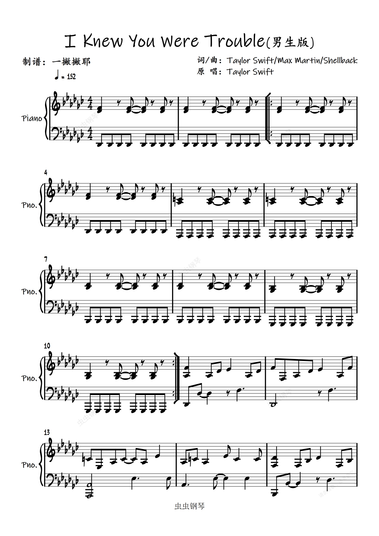 钢琴谱:【男声伴奏】I Knew You Were Trouble-Taylor Swift「一撇撇耶」