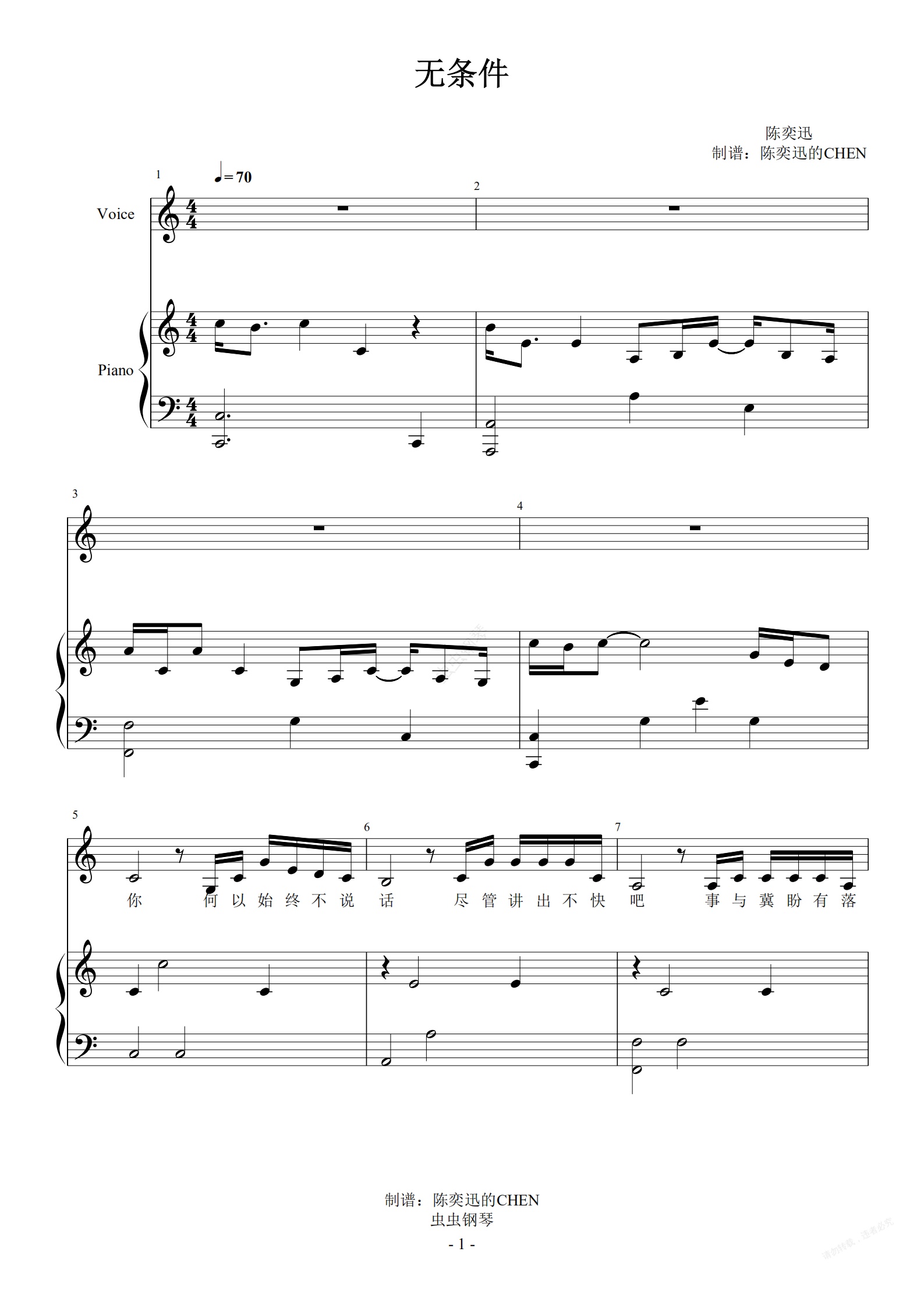 钢琴谱:无条件 C调完美弹唱谱录音版【附歌词】