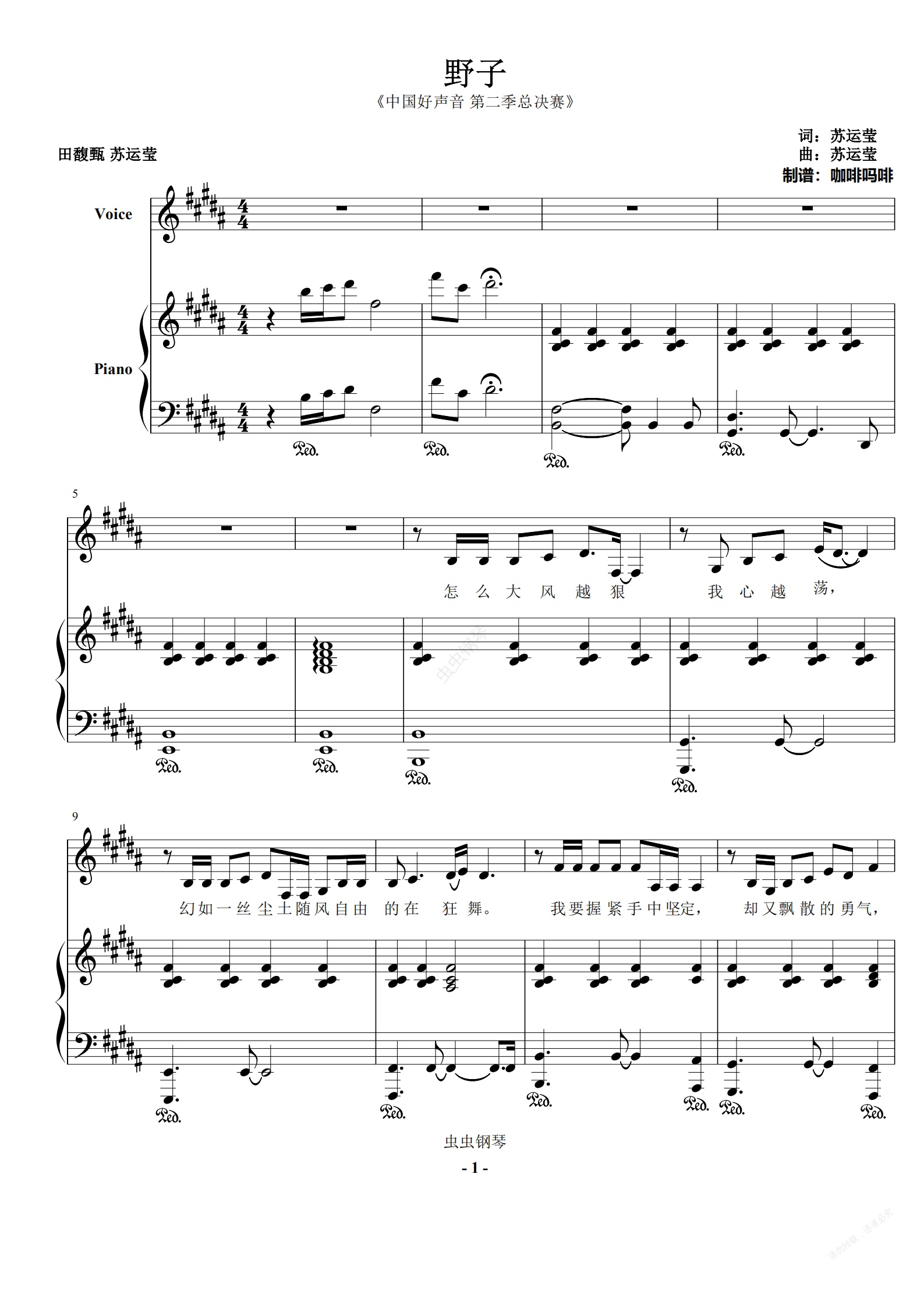 钢琴谱:野子-田馥甄 苏运莹 钢琴伴奏谱