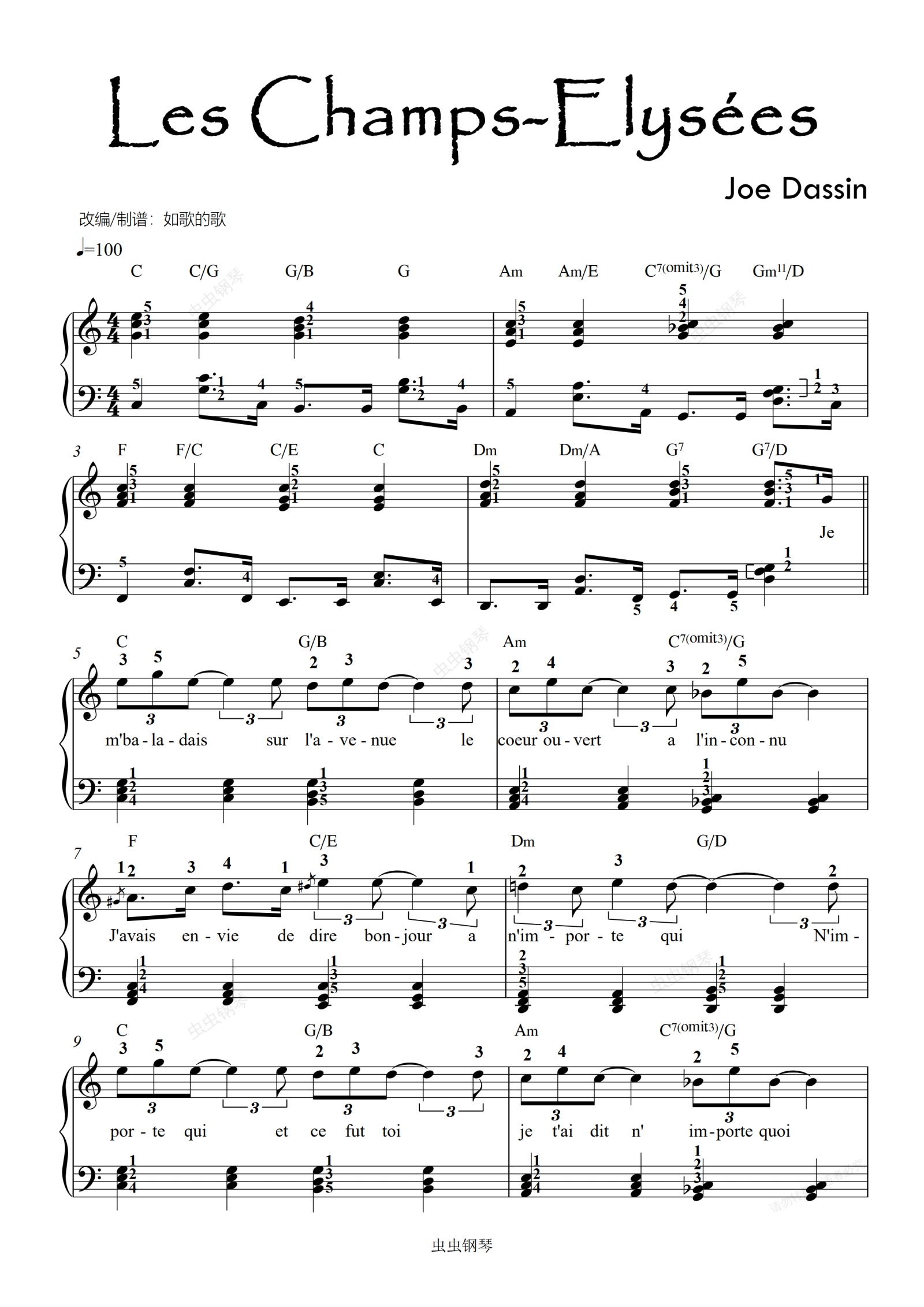 钢琴谱:Les Champs-ElyséesC调香颂代表作香榭丽舍大街可弹唱