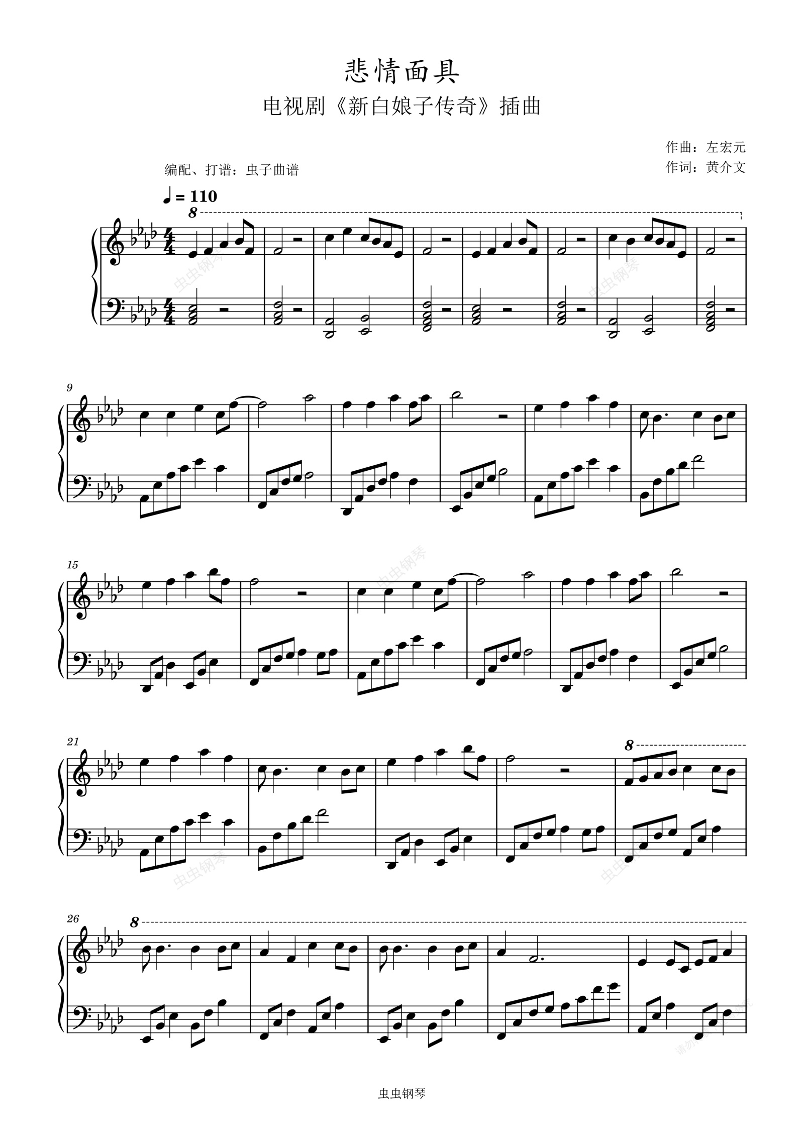 钢琴谱:悲情面具(原调简单编配)《新白娘子传奇》插曲