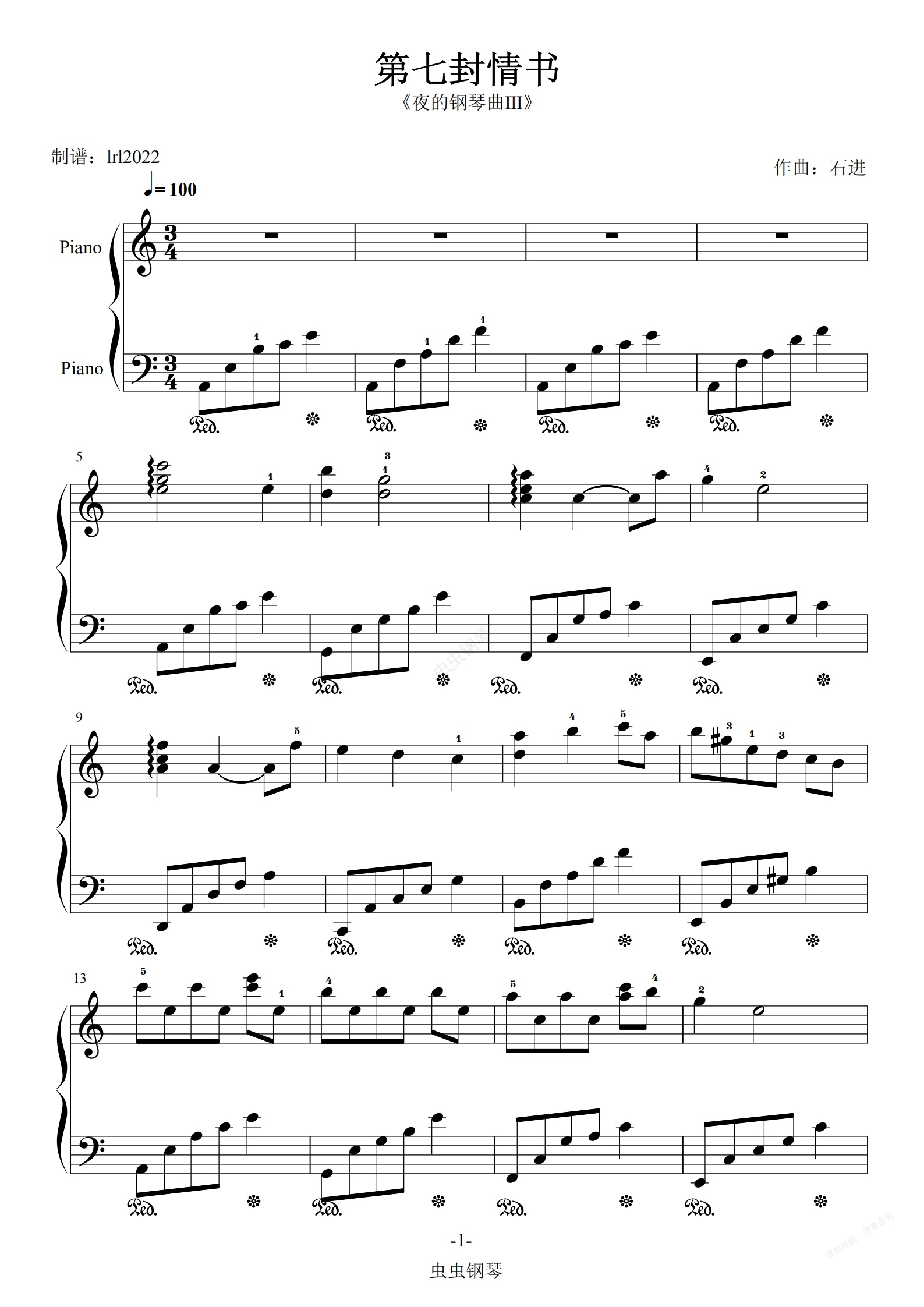钢琴谱:第七封情书-石进-指法标记-夜的钢琴曲Ⅲ-五线谱