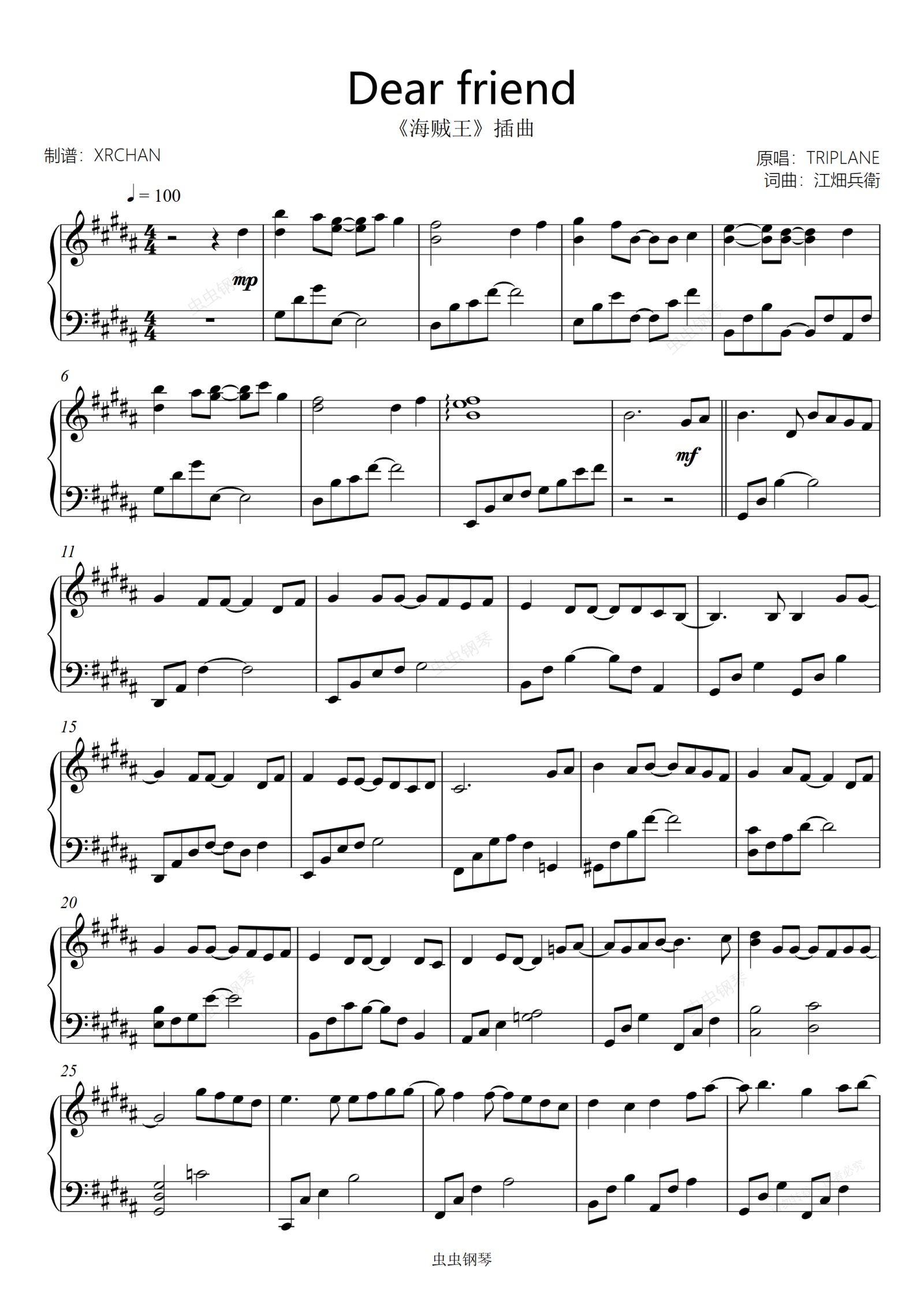 钢琴谱:《海贼王》插曲 Dear Friends 再见,梅里号