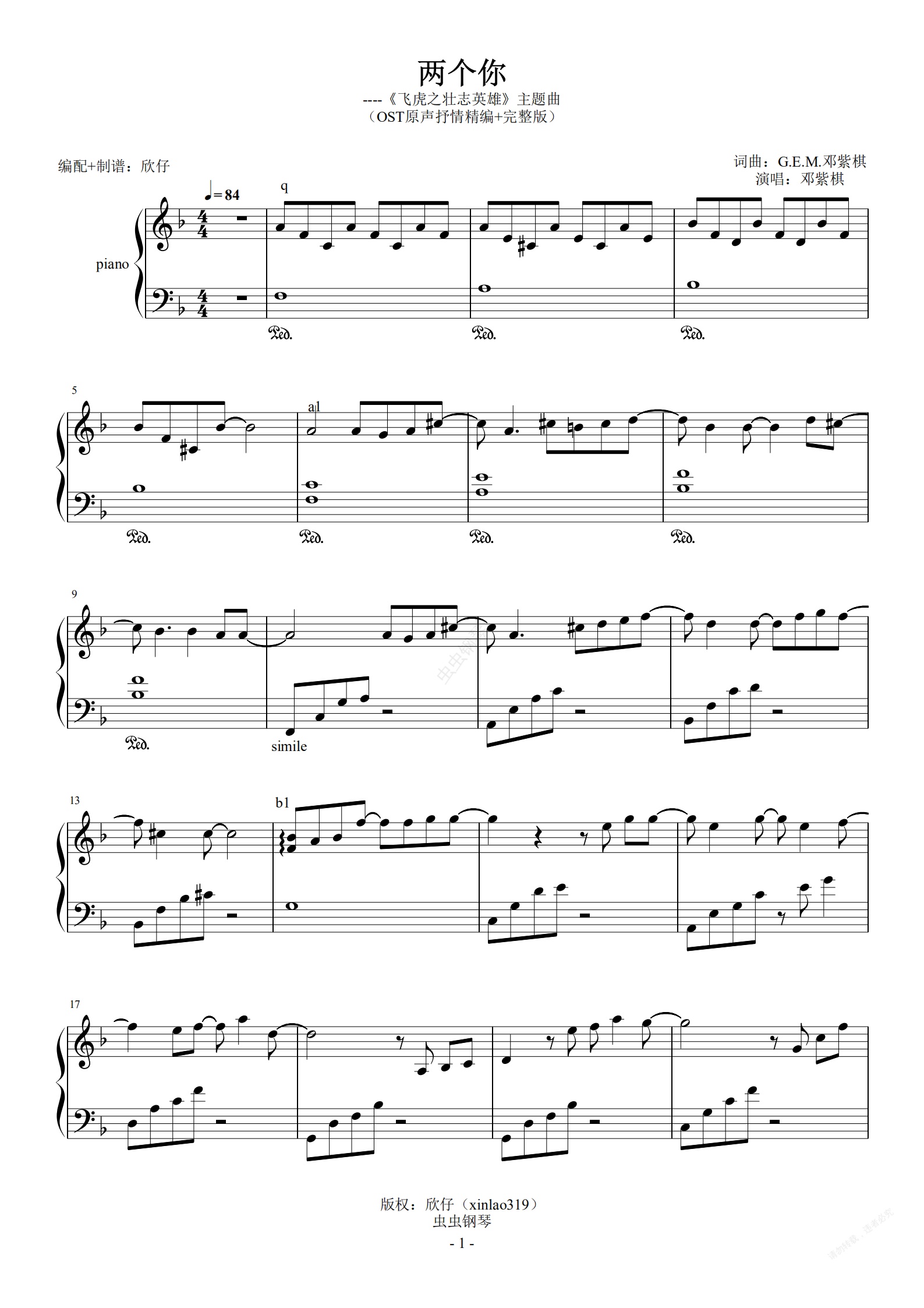 钢琴谱:G.E.M.邓紫棋-F《两个你》(原声背景音乐精编+完整版)