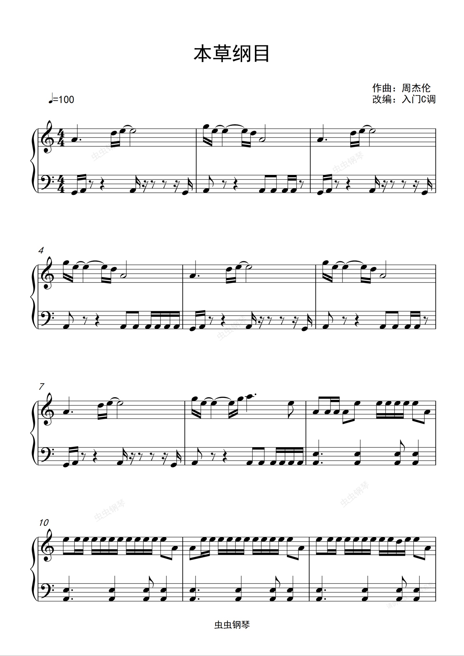 钢琴谱:周杰伦《本草纲目》入门C调简单完整版