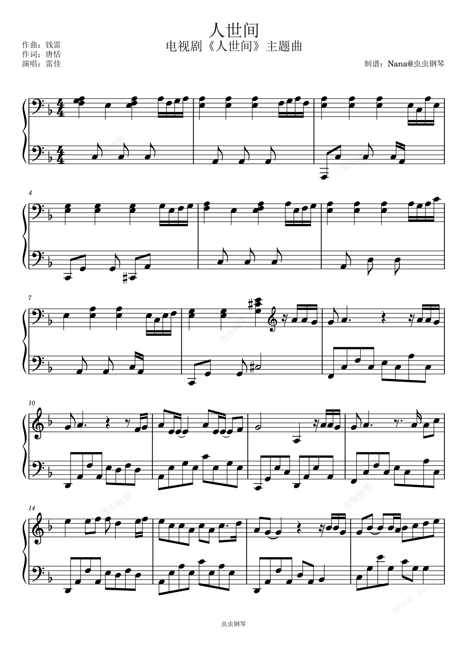钢琴谱:人世间F调—电视剧人世间主题曲