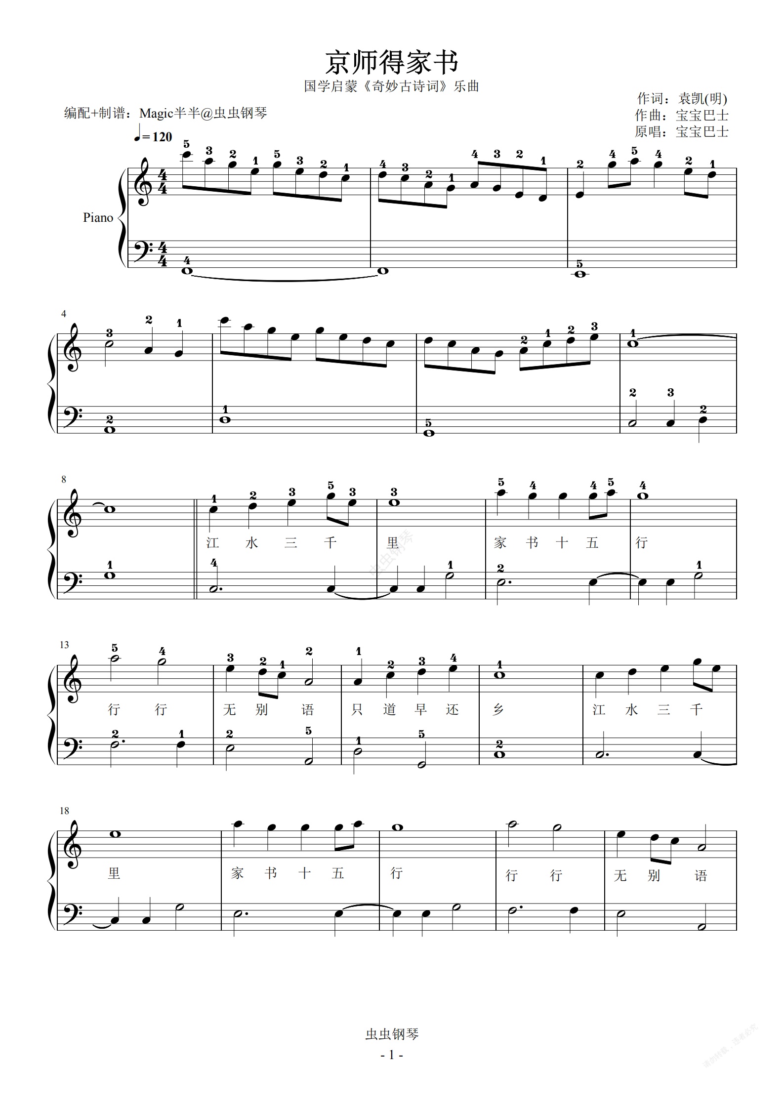 钢琴谱:奇妙古诗词/京师得家书(带指法)