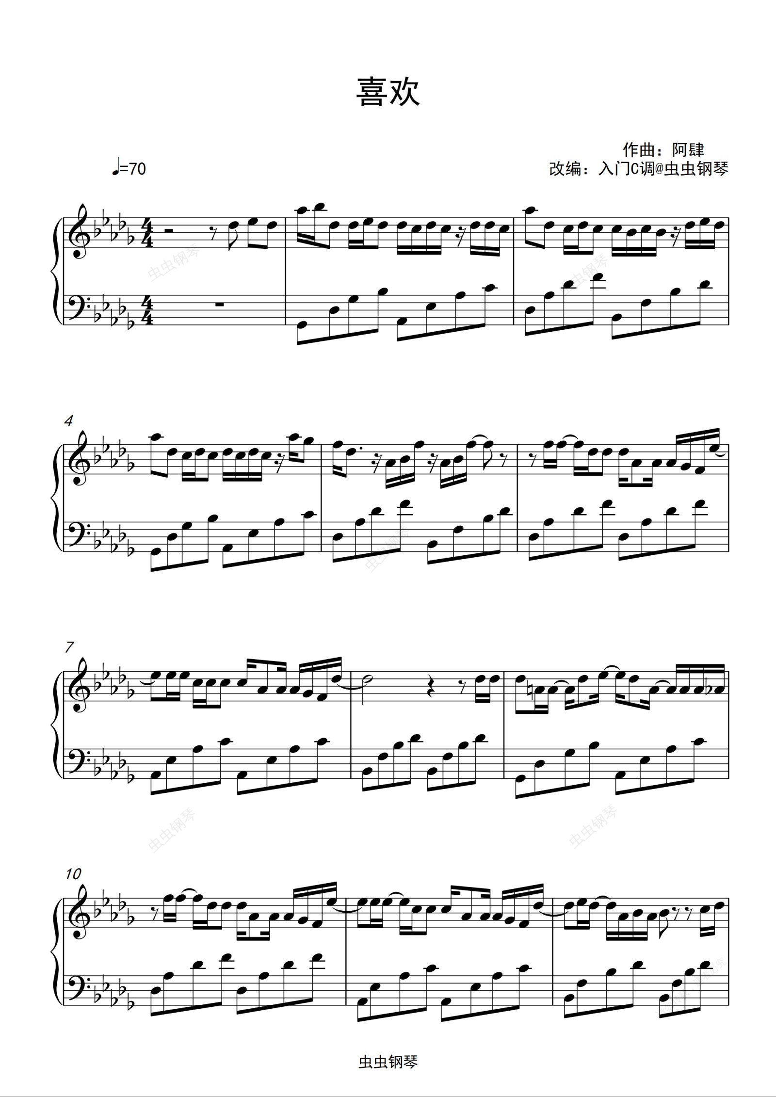 钢琴谱:阿肆《喜欢》升C大调简单版