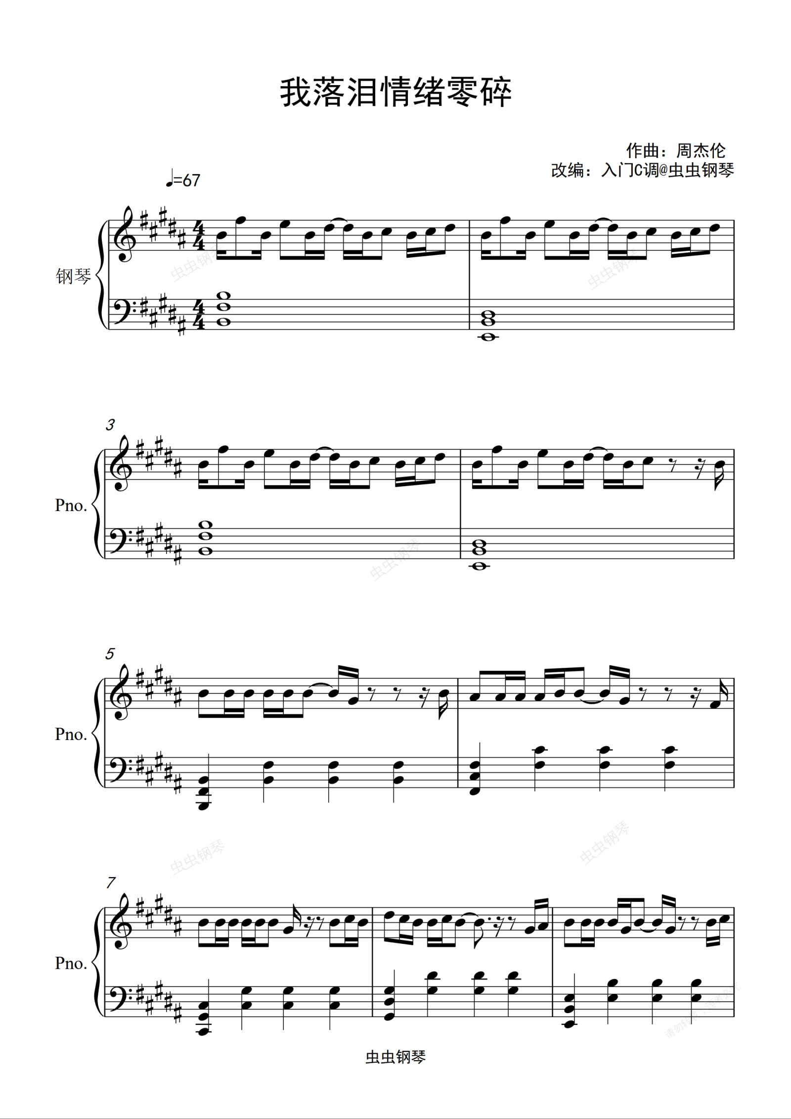 钢琴谱:周杰伦《我落泪情绪零碎》B大调简单版