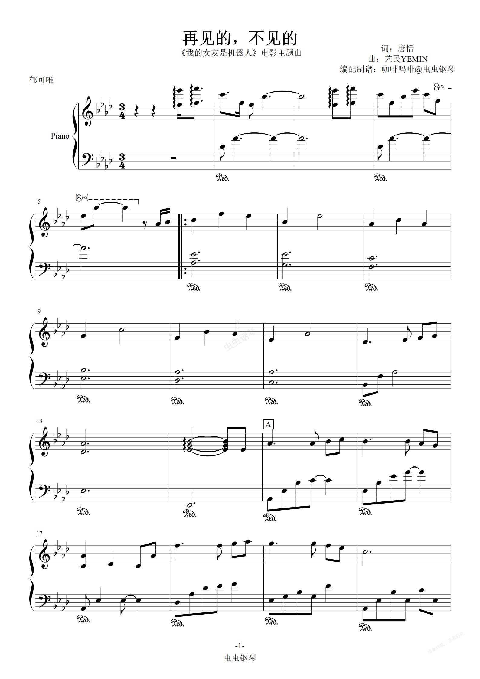 钢琴谱:再见的,不见的-郁可唯 钢琴独奏谱改编