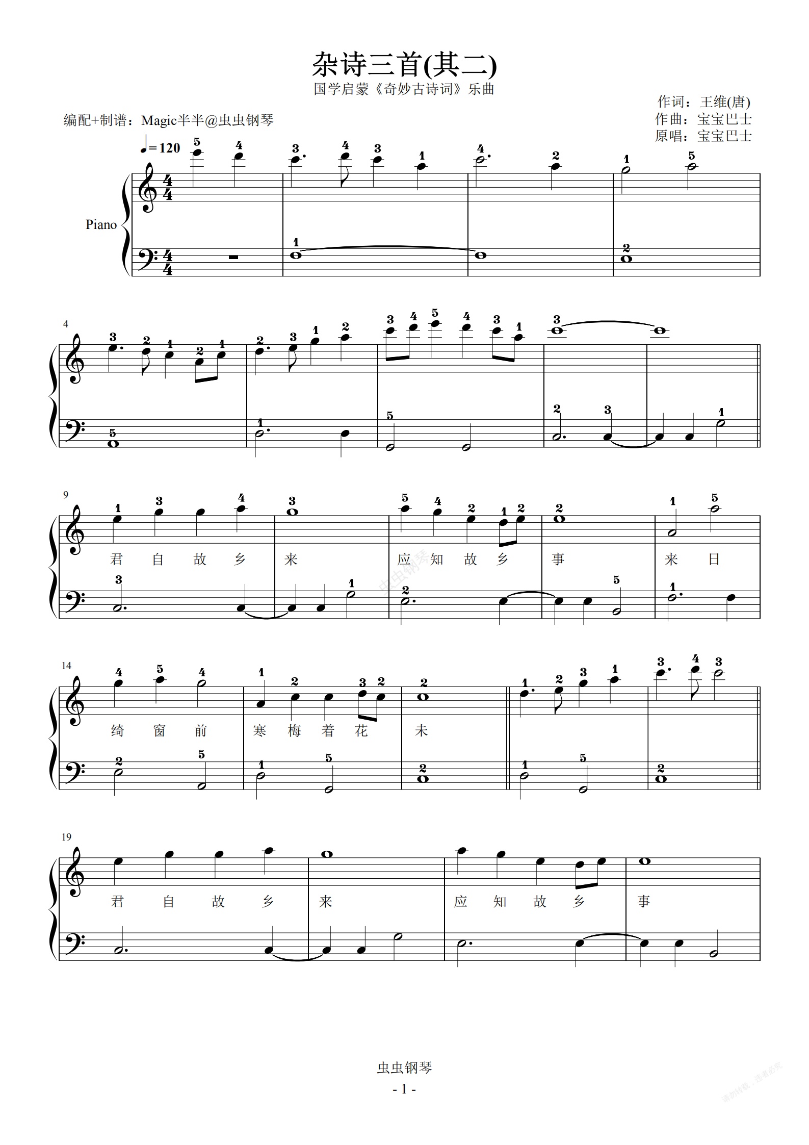 钢琴谱:奇妙古诗词/杂诗三首(其二)(带指法)