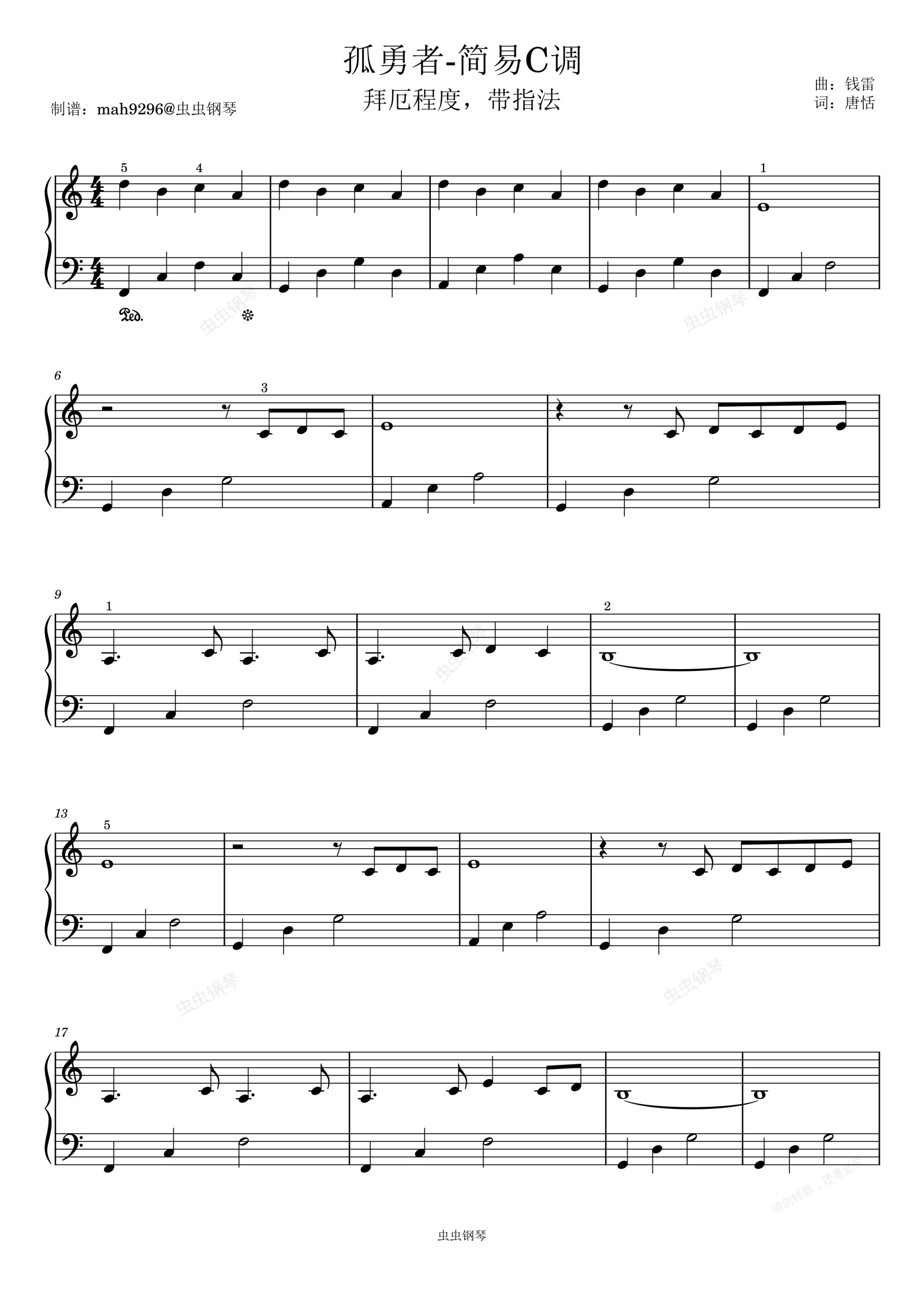 钢琴谱:孤勇者-简易C调(拜厄程度带指法)