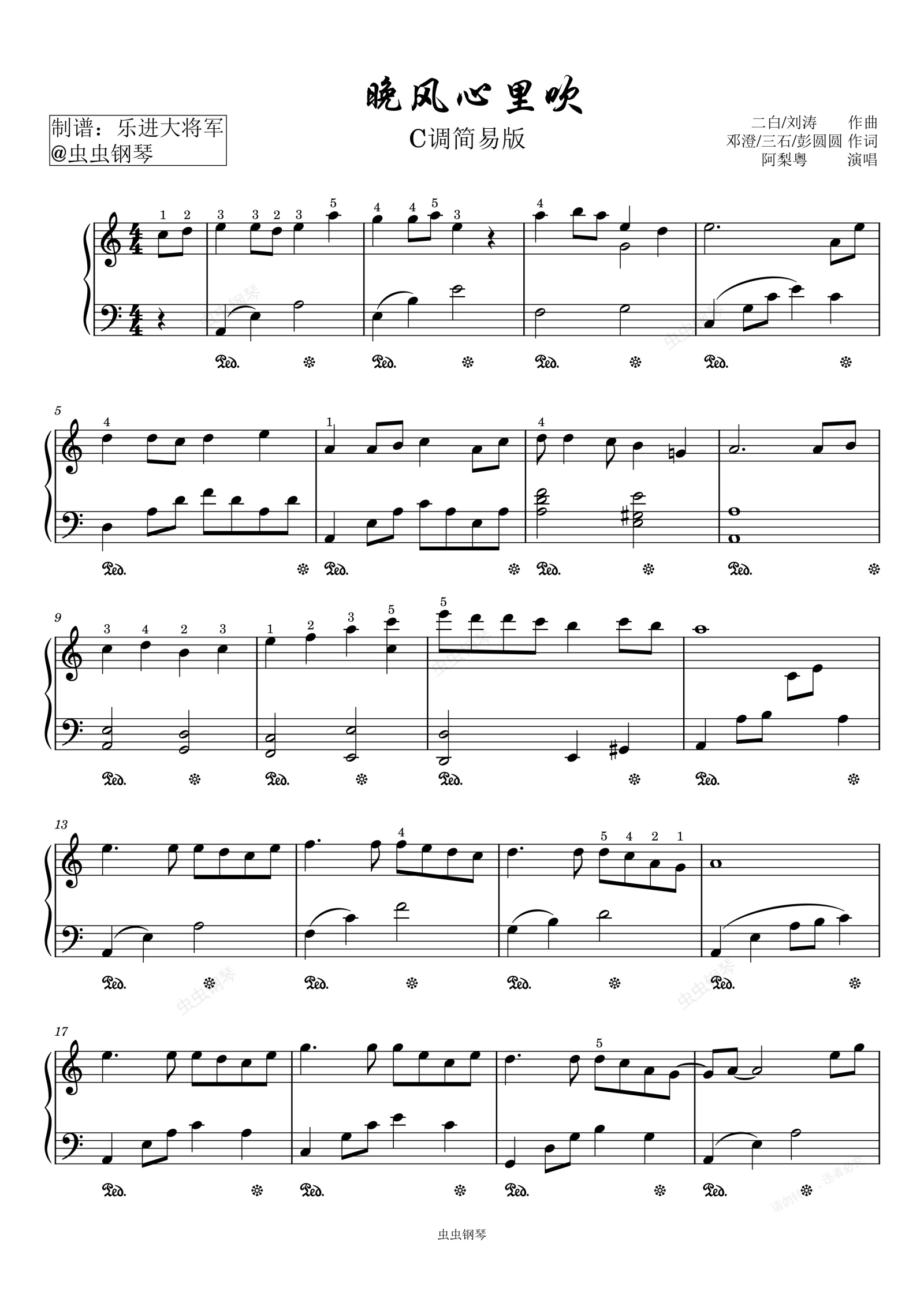 钢琴谱:【粤语】晚风心里吹 C调精简版