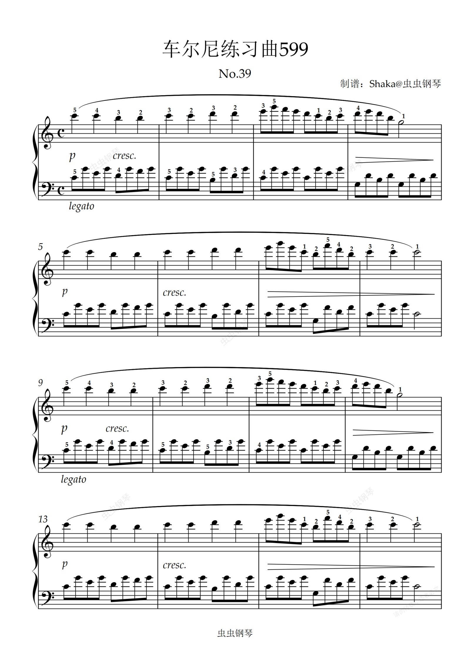 钢琴谱:车尔尼练习曲599 No.39 C调版 带指法