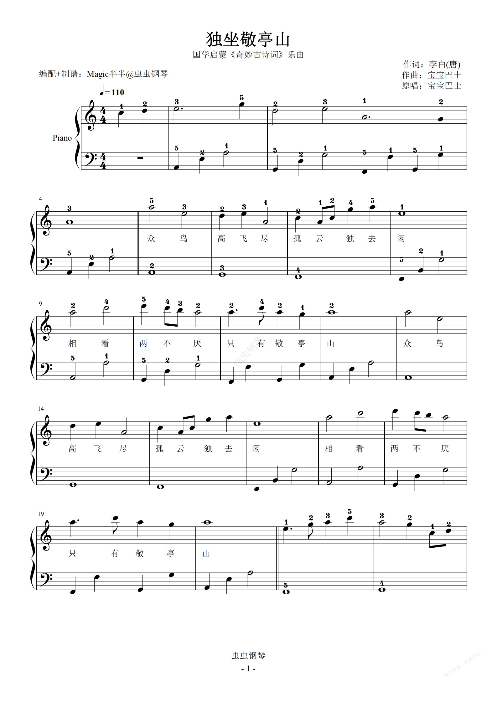 钢琴谱:奇妙古诗词/独坐敬亭山(带指法)