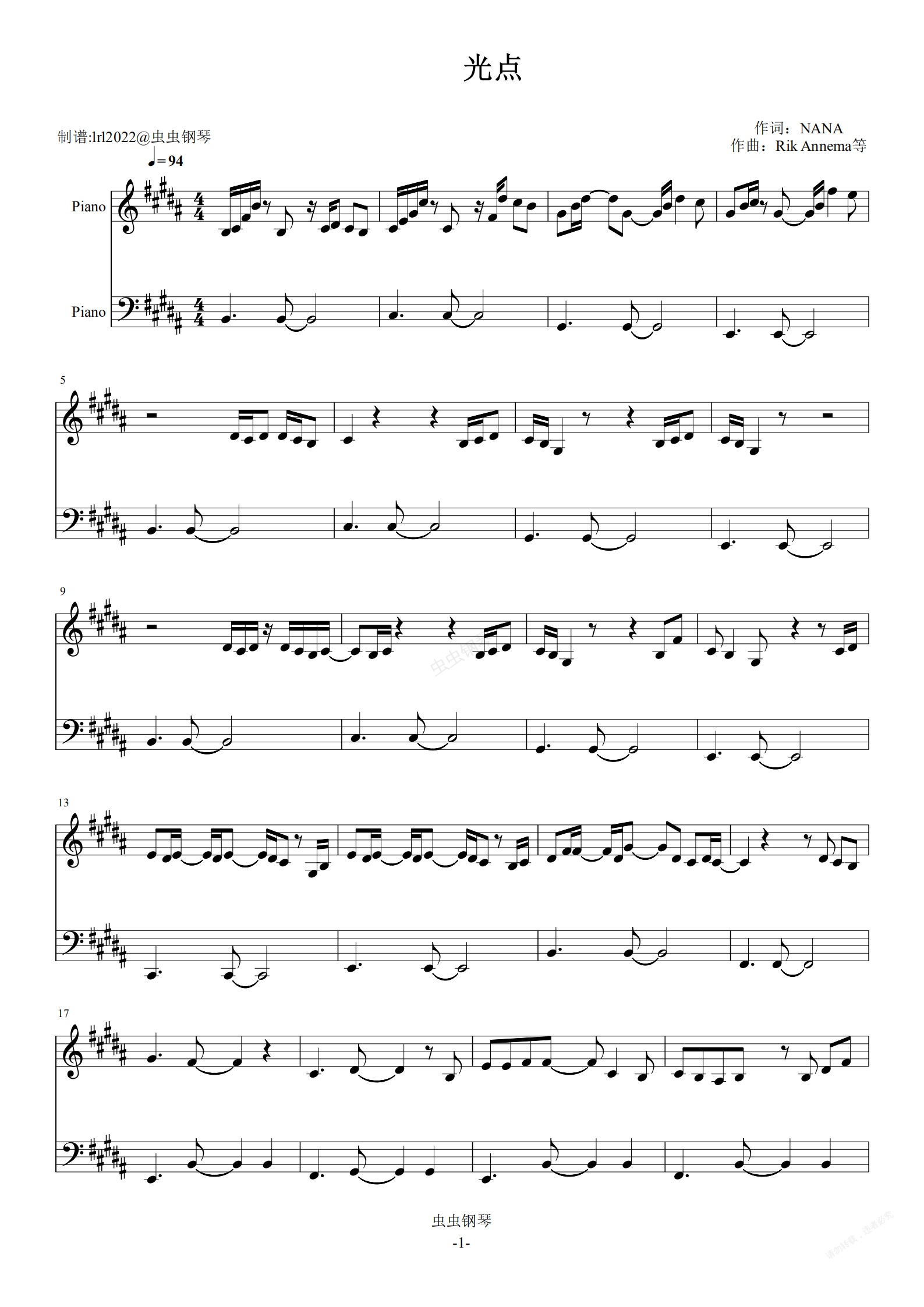 钢琴谱:光点-肖战--独奏版-五线谱