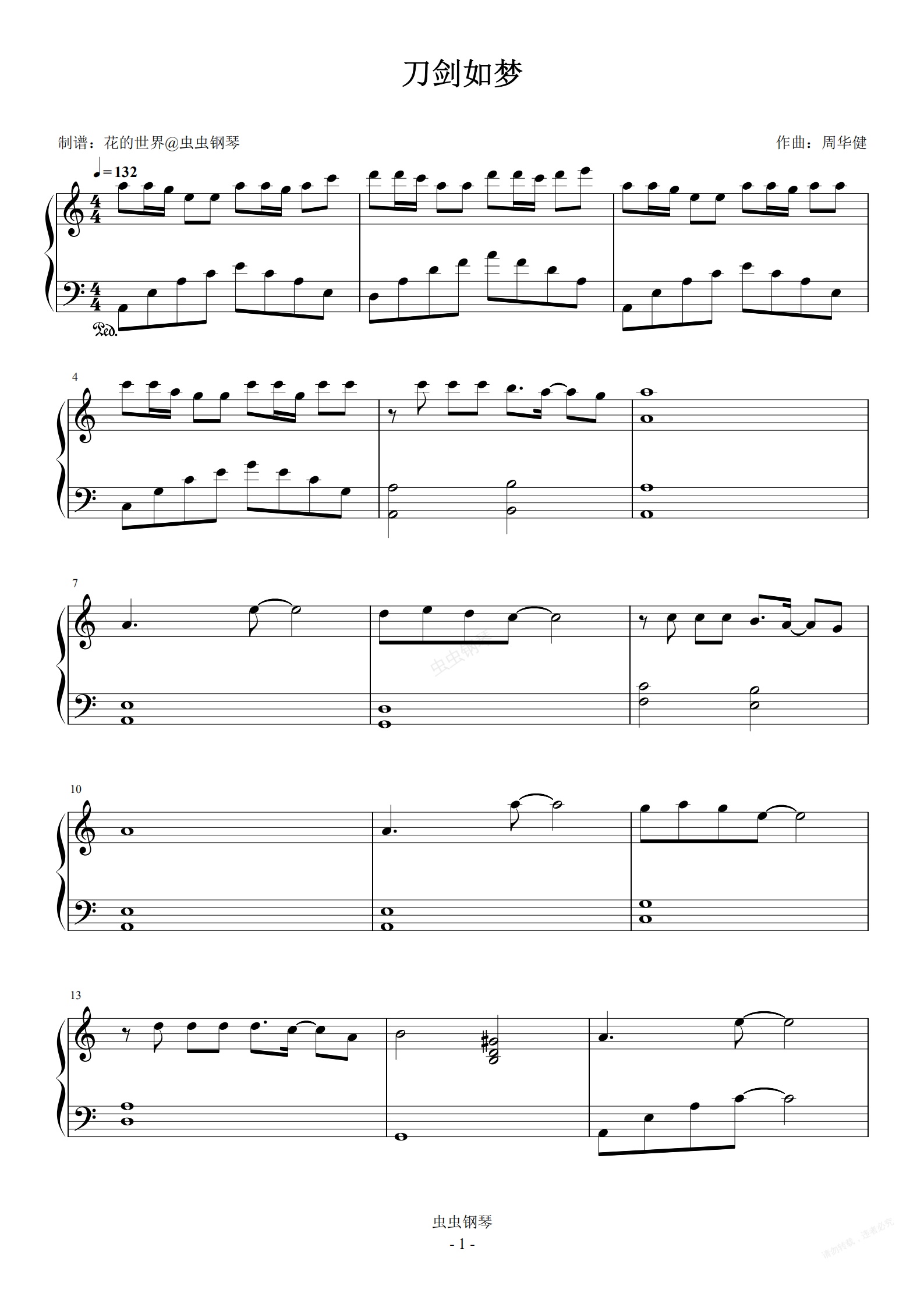 钢琴谱:刀剑如梦 C调简易版 周华健