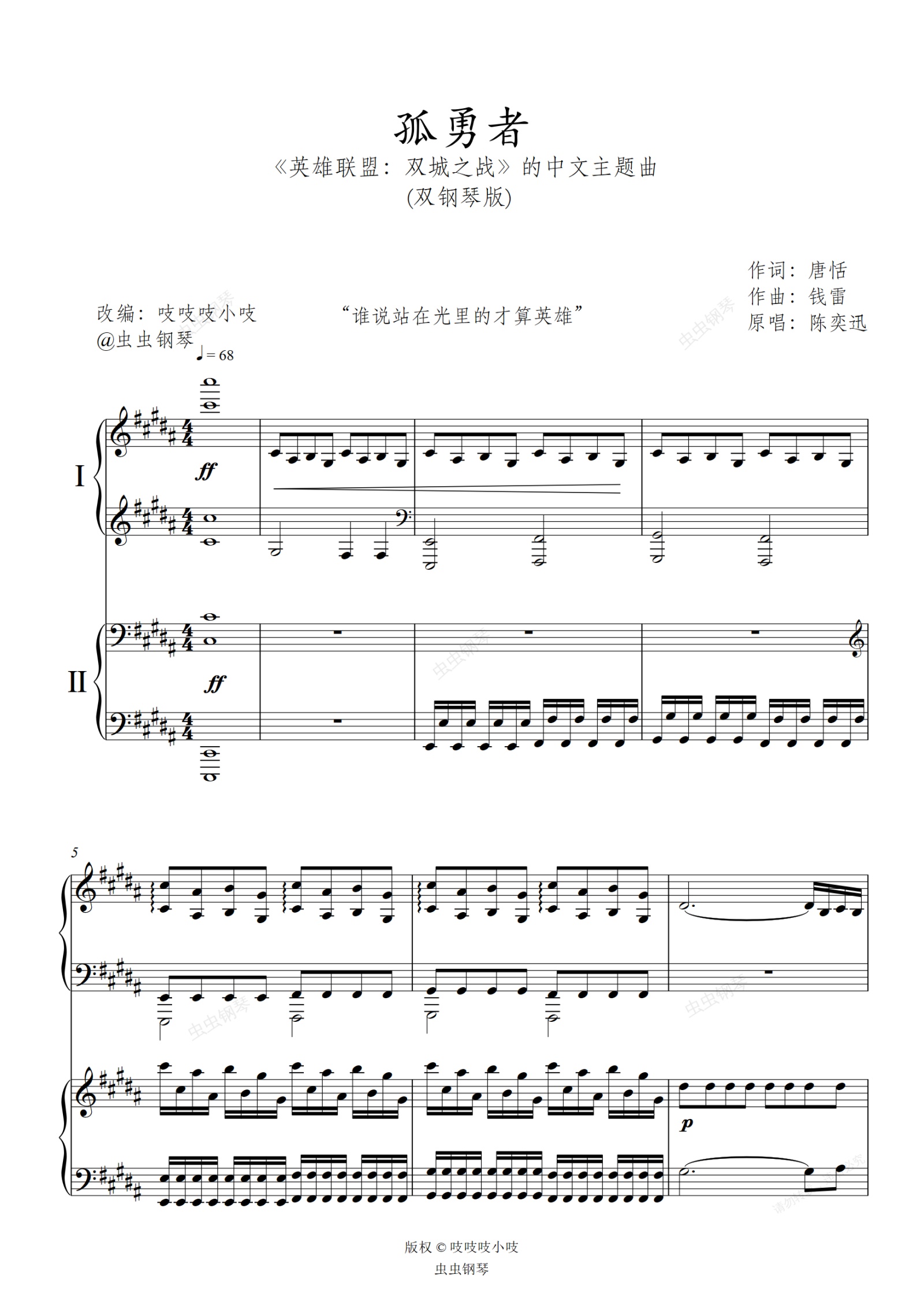 钢琴谱:孤勇者 双钢琴版 原调 《英雄联盟:双城之战》的中文主题曲