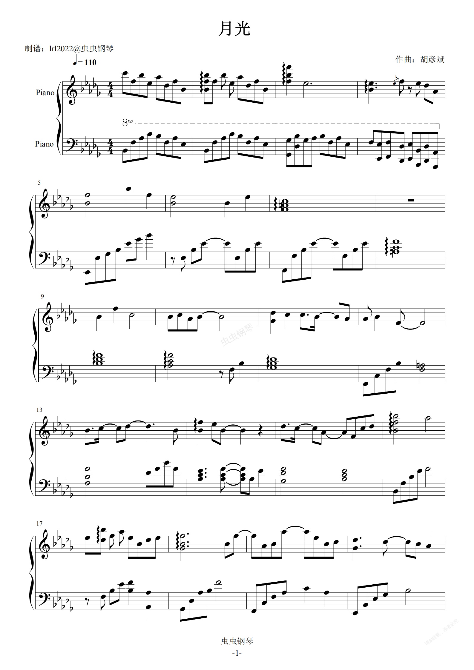 钢琴谱:月光-胡彦斌-秦时明月片头曲-五线谱